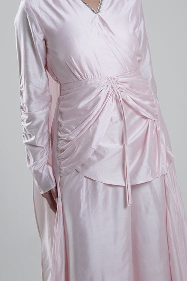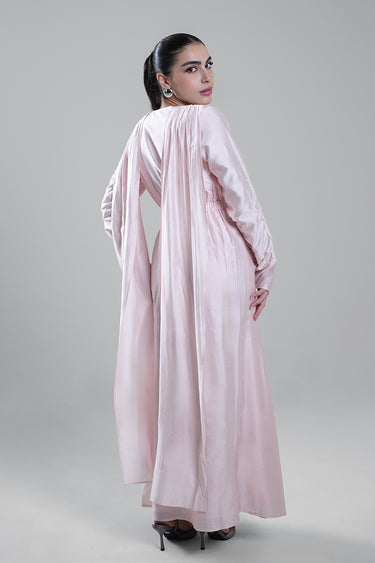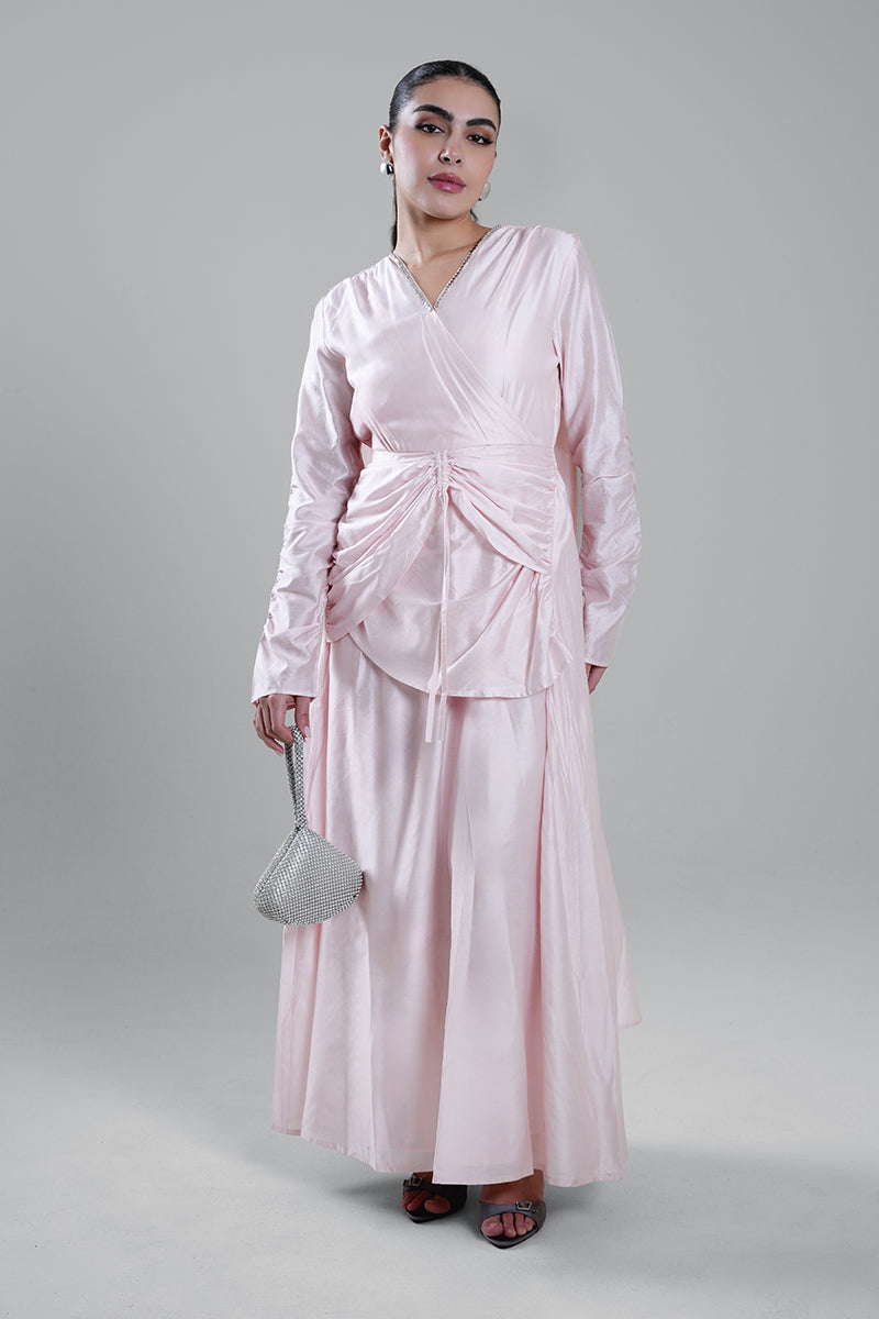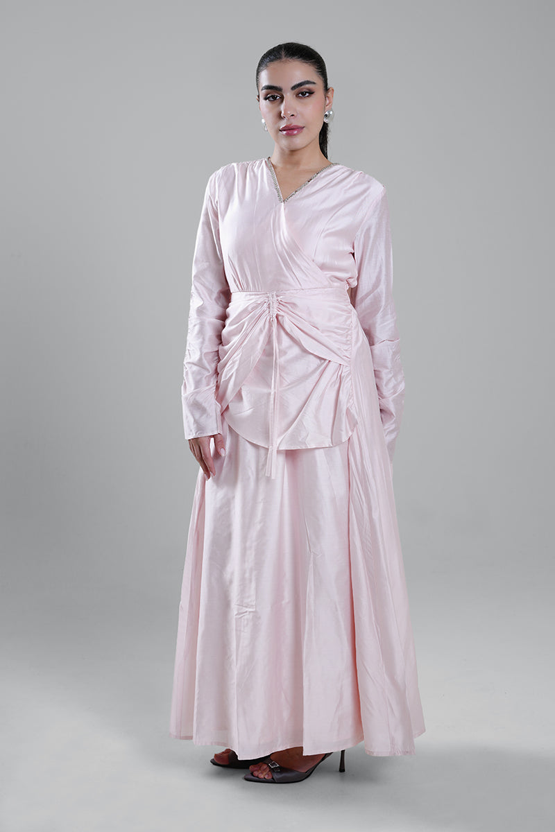 فستان نسائي طويل بتصميم أنيق وقصة لف من الأمام مع تفاصيل مجمعة عند الخصر تبرز القوام بشكل ناعم ومتوازن. يتميز بأكمام طويلة وياقة على شكل حرف V، مع تنورة انسيابية تمنح حركة خفيفة وأناقة راقية. تصميم مثالي للمناسبات الراقية والإطلالات المسائية أو النهارية الأنيقة.