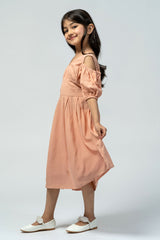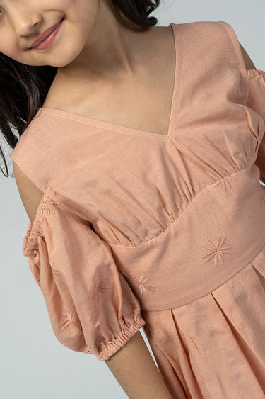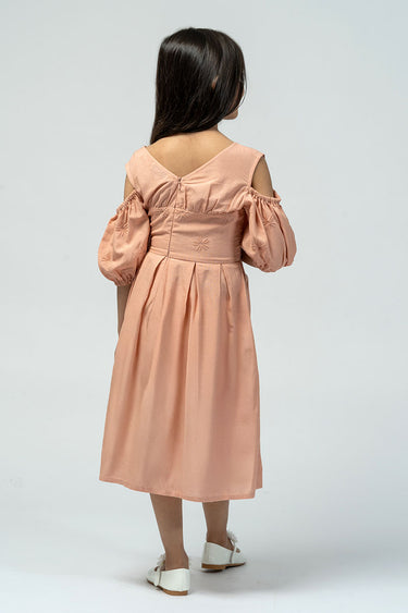 فستان ميدي أنيق بتفاصيل تطريز ناعمة. يتميز بياقة على شكل V، وأكمام منفصلة بتصميم منفوش، وتنورة بثنيات خفيفة تمنح حركة مريحة ولمسة راقية للارتداء اليومي.
