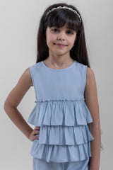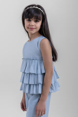 بلوزة بنات بدون أكمام بقصة مريحة وياقة دائرية، تتميز بتصميم طبقات مكشكشة تضيف لمسة أنيقة وحركة خفيفة. عملية وسهلة التنسيق، مناسبة للاستخدام اليومي والإطلالات الكاجوال
