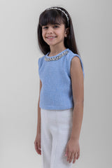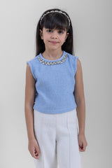 بلوزة أنيقة للبنات بتصميم بدون أكمام، تتميز بتفاصيل مُزخرفة ناعمة حول الياقة ونسيج محبوك يمنحها مظهراً راقياً ومريحاً. مثالية للمناسبات الخاصة أو الإطلالات اليومية الأنيقة.