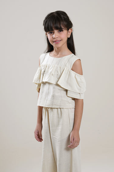 بلوزة بناتي بتصميم عصري يتميز بفتحات عند الأكتاف مع تفاصيل كشكش ناعمة. تأتي بقصة مريحة تناسب الارتداء اليومي، ويمكن تنسيقها بسهولة مع البنطلونات أو التنانير لإطلالة كاجوال أنيقة.