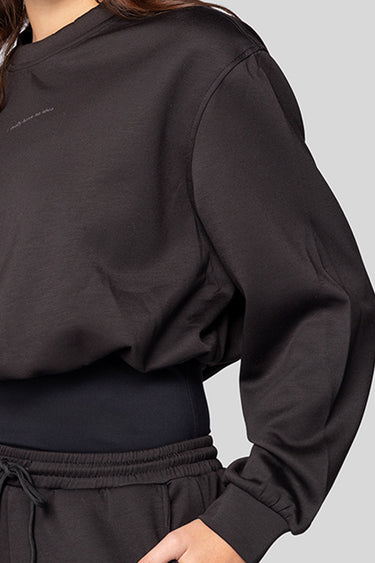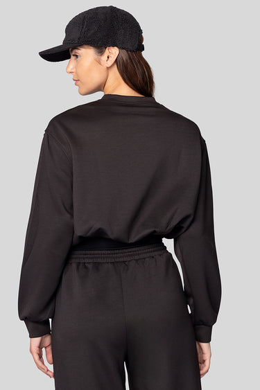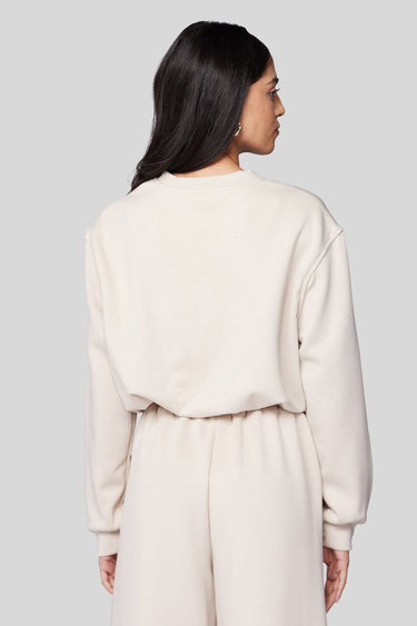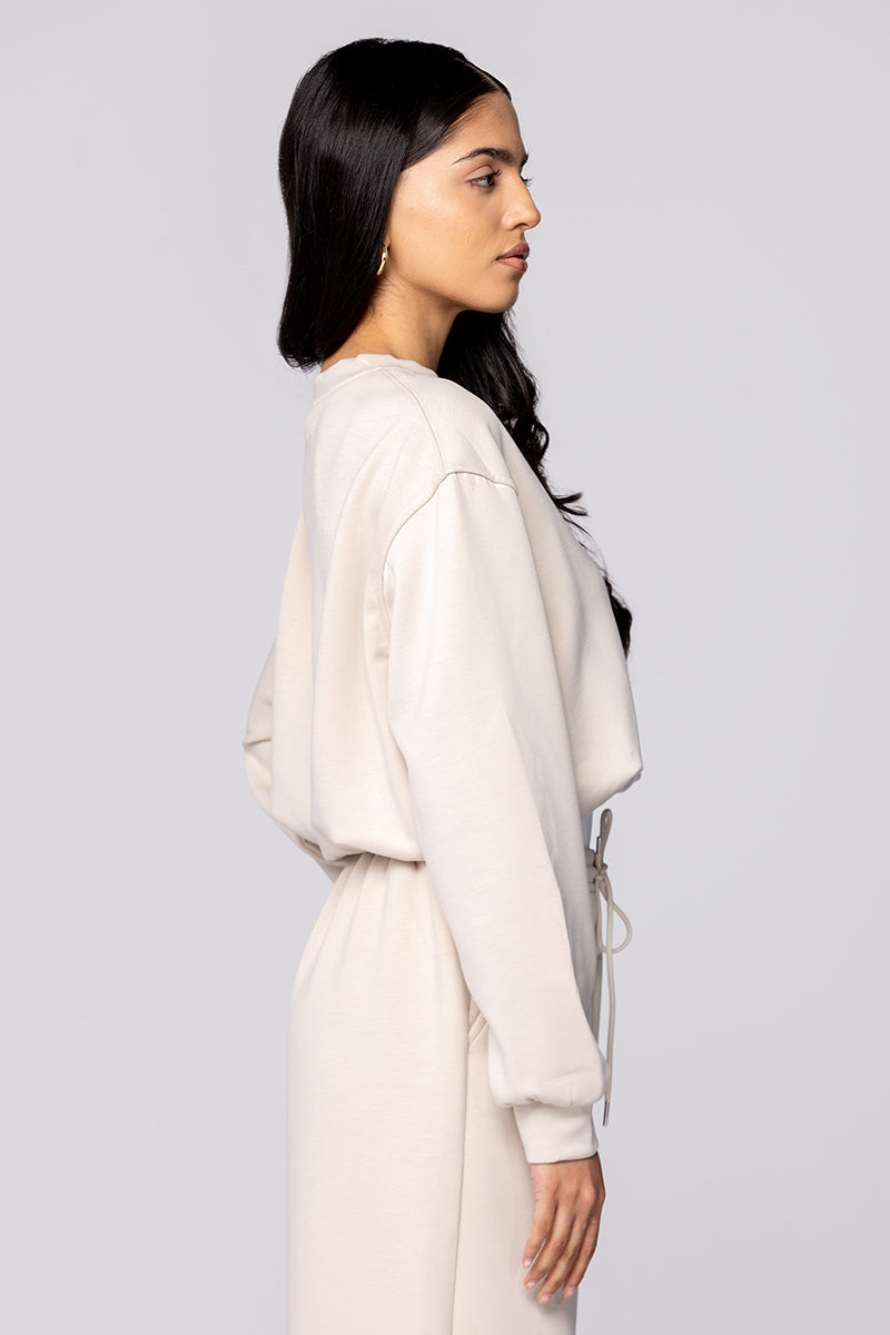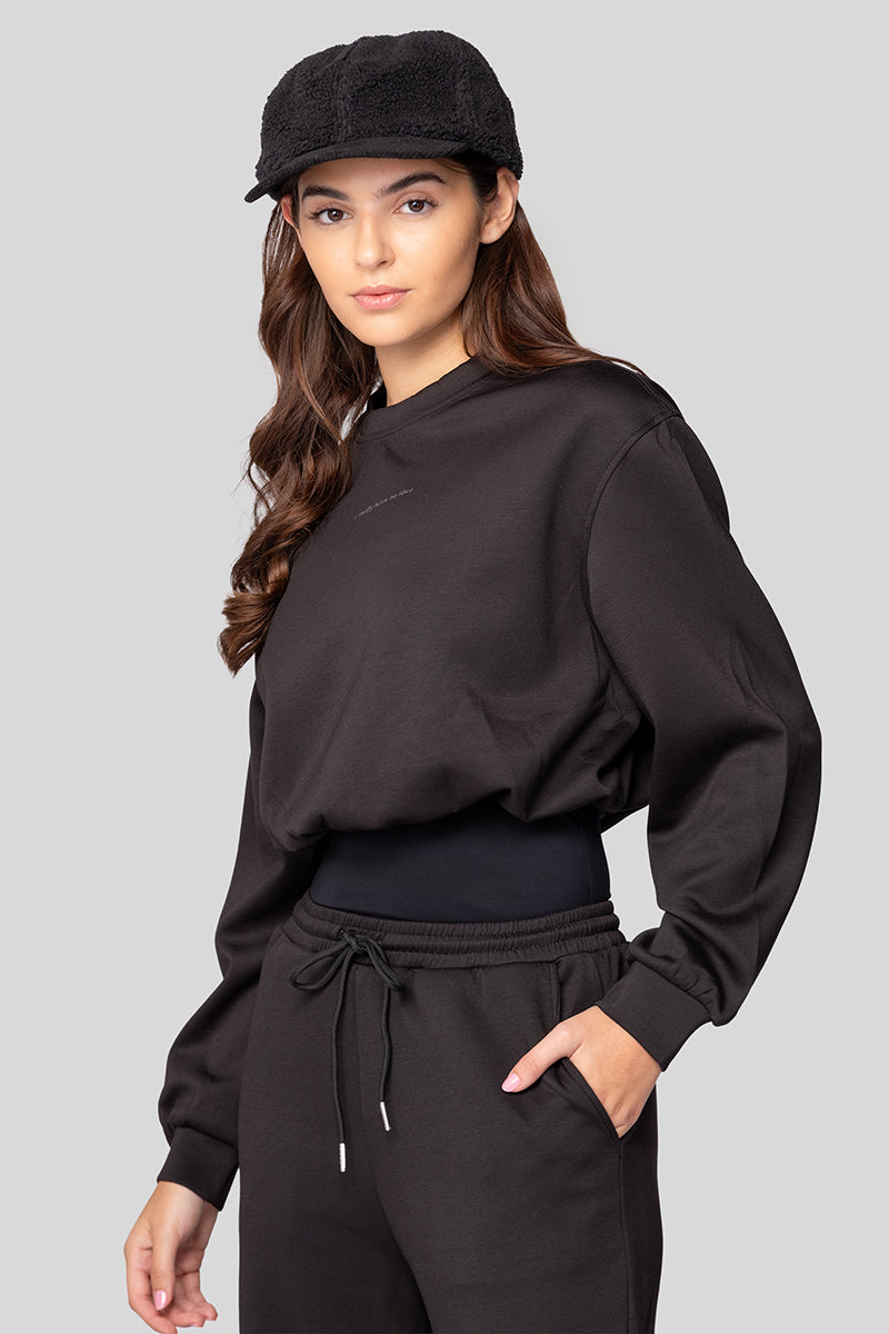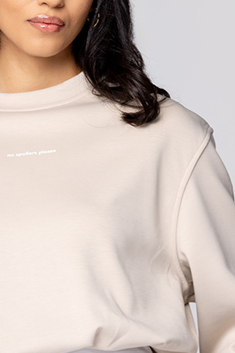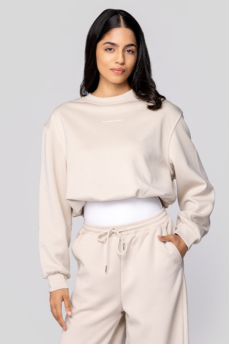 سويت شيرت قصير مع أكمام طويلة وياقة دائرية. يتميز بتفصيل مطبوع صغير على الأمام ليضفي لمسة عصرية. ناعم ومريح مثالي للإطلالات اليومية الكاجوال.