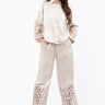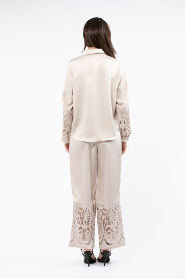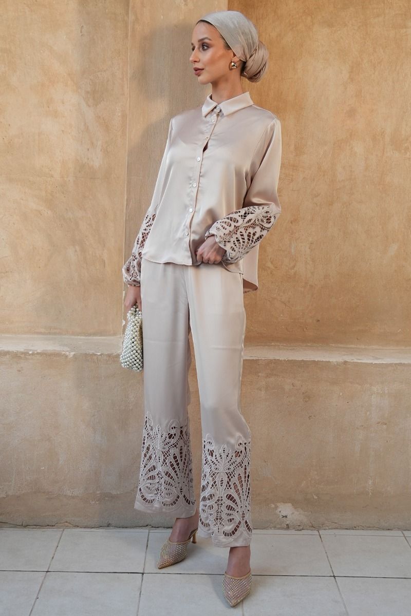 نمط ذو لون موحد مزين بتفاصيل فتحات مخرمة مطرزة على الساقين