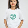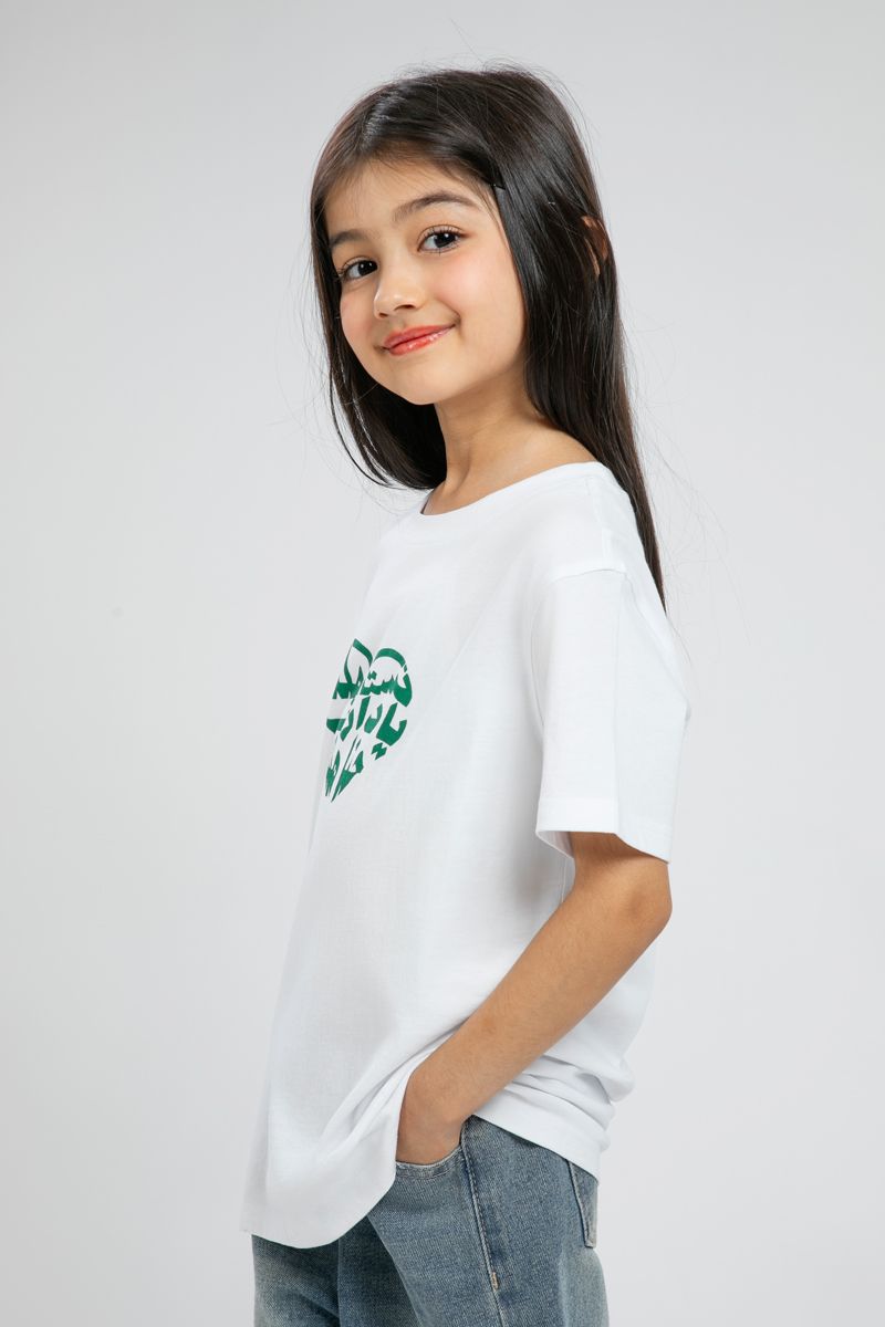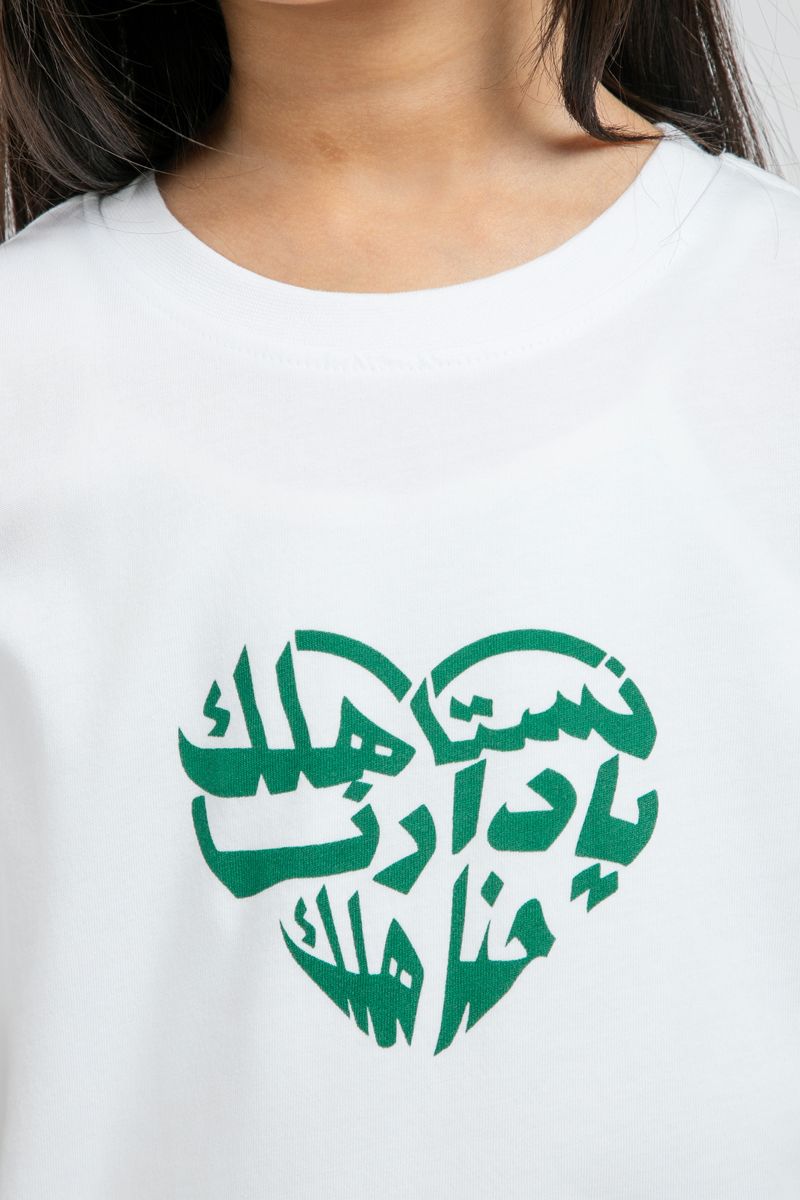 تيشيرت بناتي مزين بطبعة بخط عربي على شكل قلب تعبر عن حب الوطن والاعتزاز به يتميز بقصة مريحة وأكمام قصيرة لإطلالة يومية تجمع بين الراحة والطابع التراثي