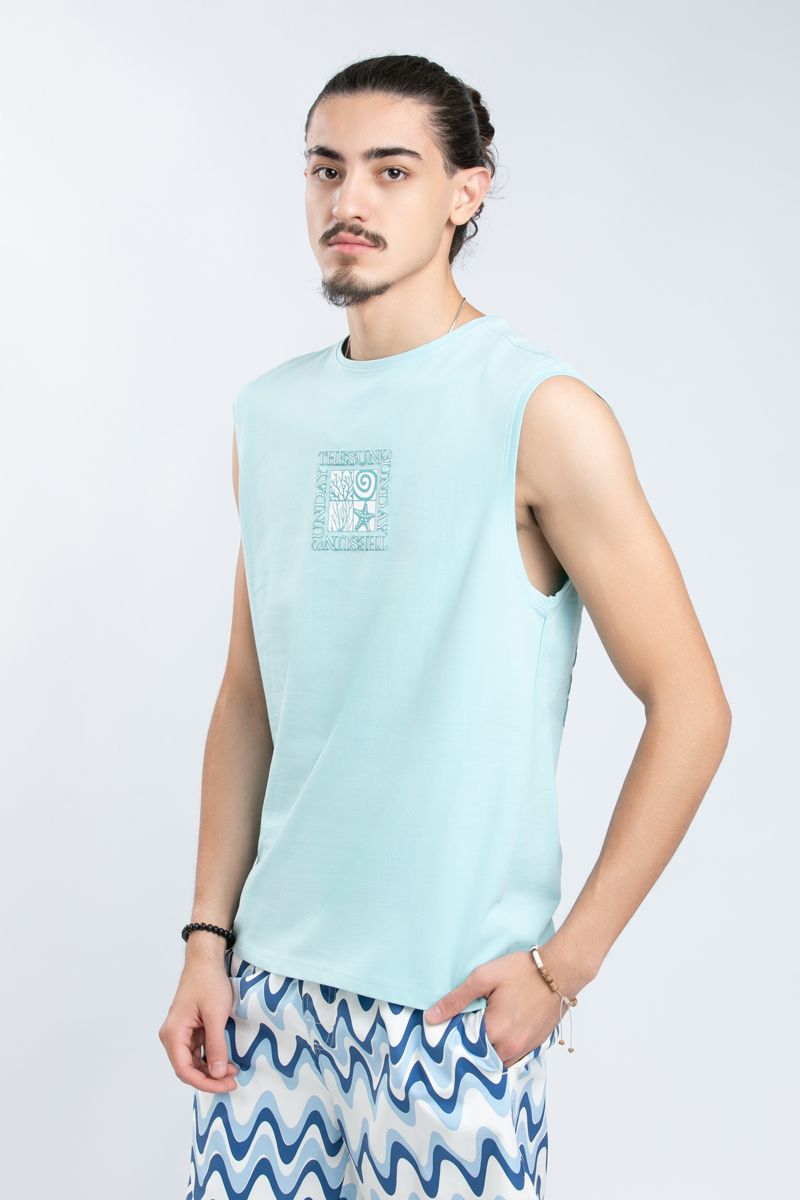 امنح إطلالتك لمسة عصرية مع هذا التيشيرت الرجالي بدون أكمام، بتصميم مميز يضم طبعات أمامية وخلفية لافتة. مصنوع من قماش مريح وخفيف مع ياقة دائرية كلاسيكية، مثالي للتمارين أو للإطلالات اليومية المريحة.