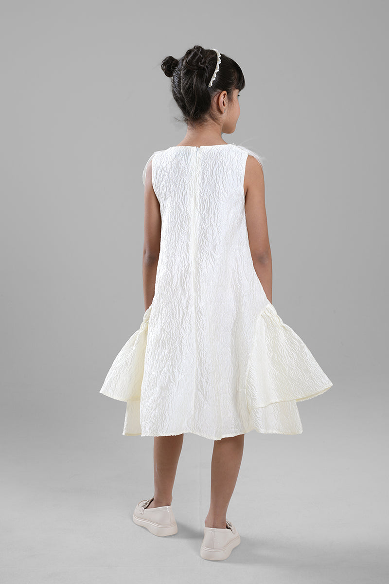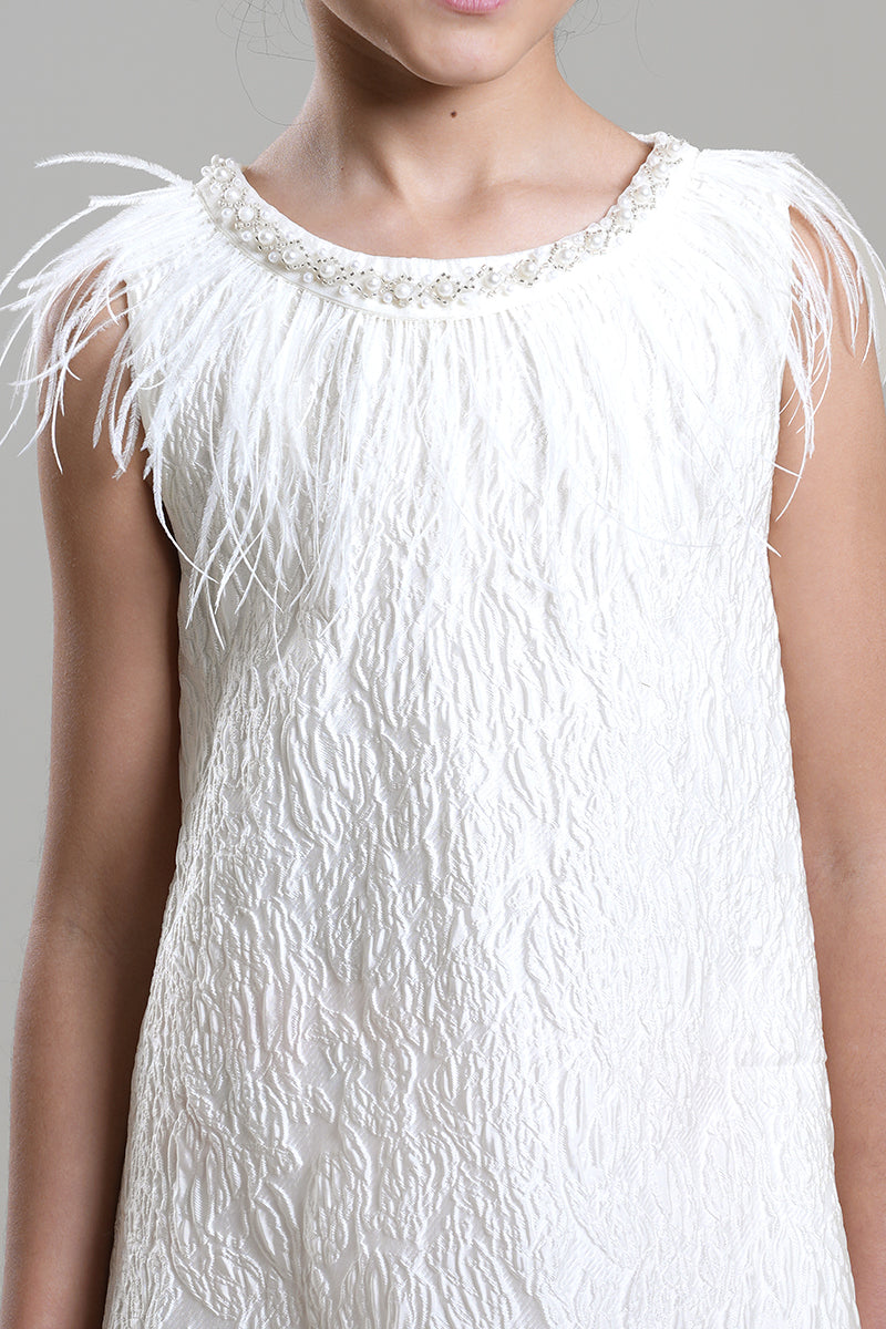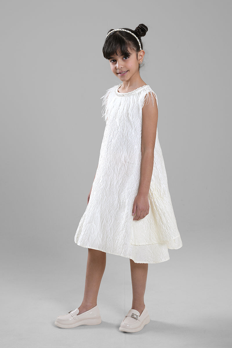 فستان بناتي أنيق يتميز بياقة كلاسيكية وتفاصيل من الريش عند الأكمام والحافة السفلية. يأتي بقصة مريحة ولمسة فاخرة تضيف طابعًا مرحًا ومميزًا. مناسب للمناسبات الخاصة، الاحتفالات، والإطلالات التي تحتاج إلى لمسة مختلفة ولافتة.