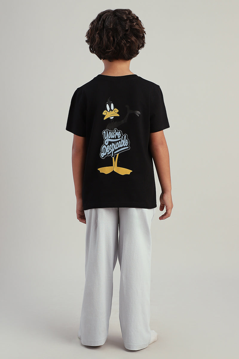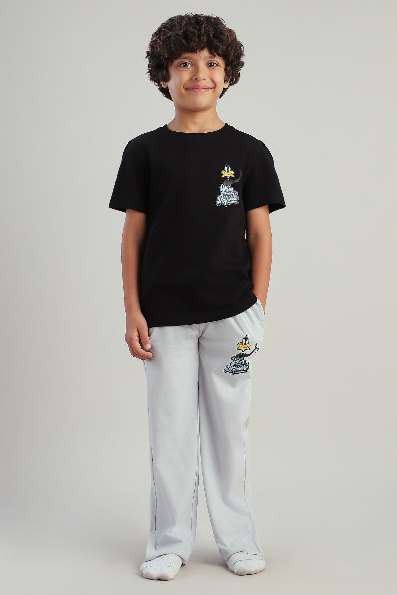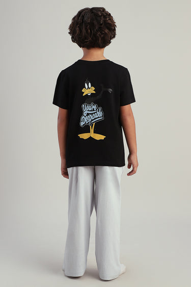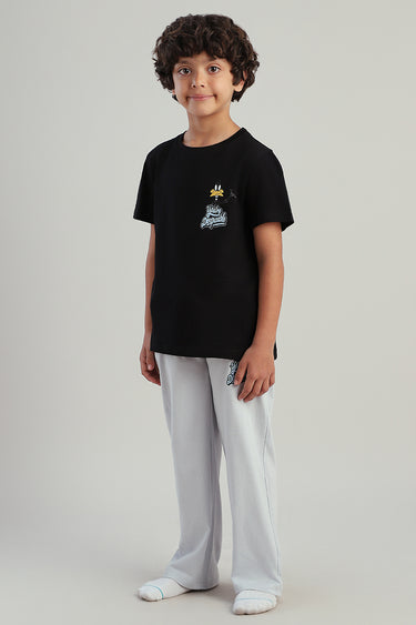 طقم أطفال للبيت مكون من تيشيرت بأكمام قصيرة مع بنطلون مريح بقصة عملية يوفر راحة وسهولة في الارتداء ومناسب للاستخدام اليومي