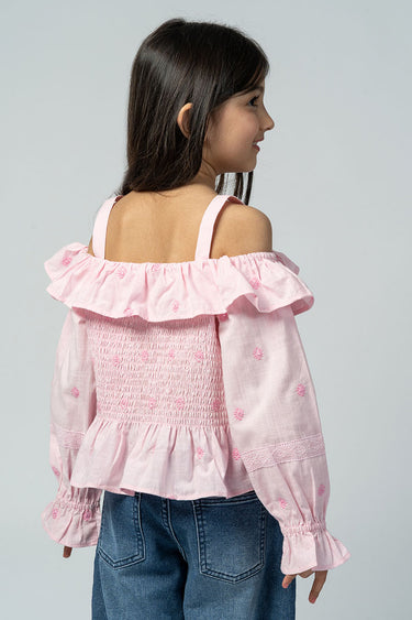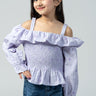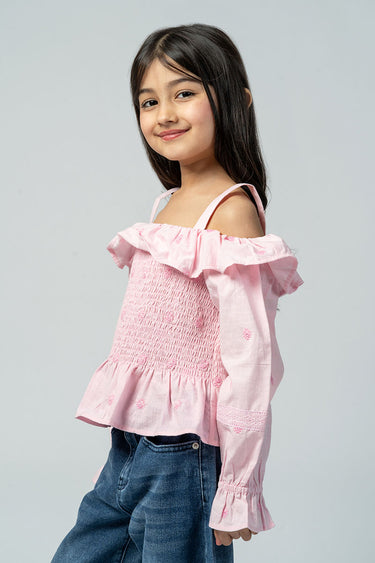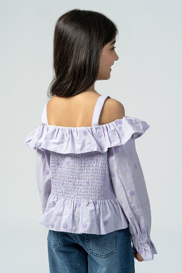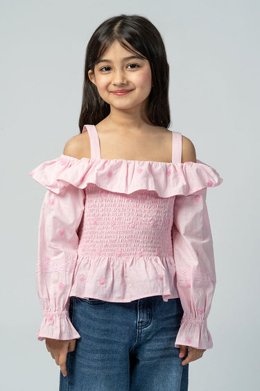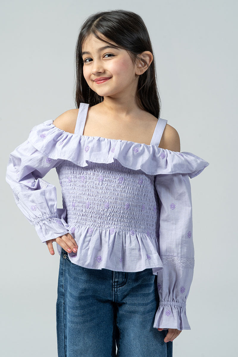 بلوزة بقصة أكتاف مكشوفة مع كشكشة ناعمة وتفاصيل مكشكشة في الجزء العلوي. تتميز بأكمام طويلة وقصة مريحة تمنح مظهرًا عصريًا وخفيفًا للاستخدام اليومي.