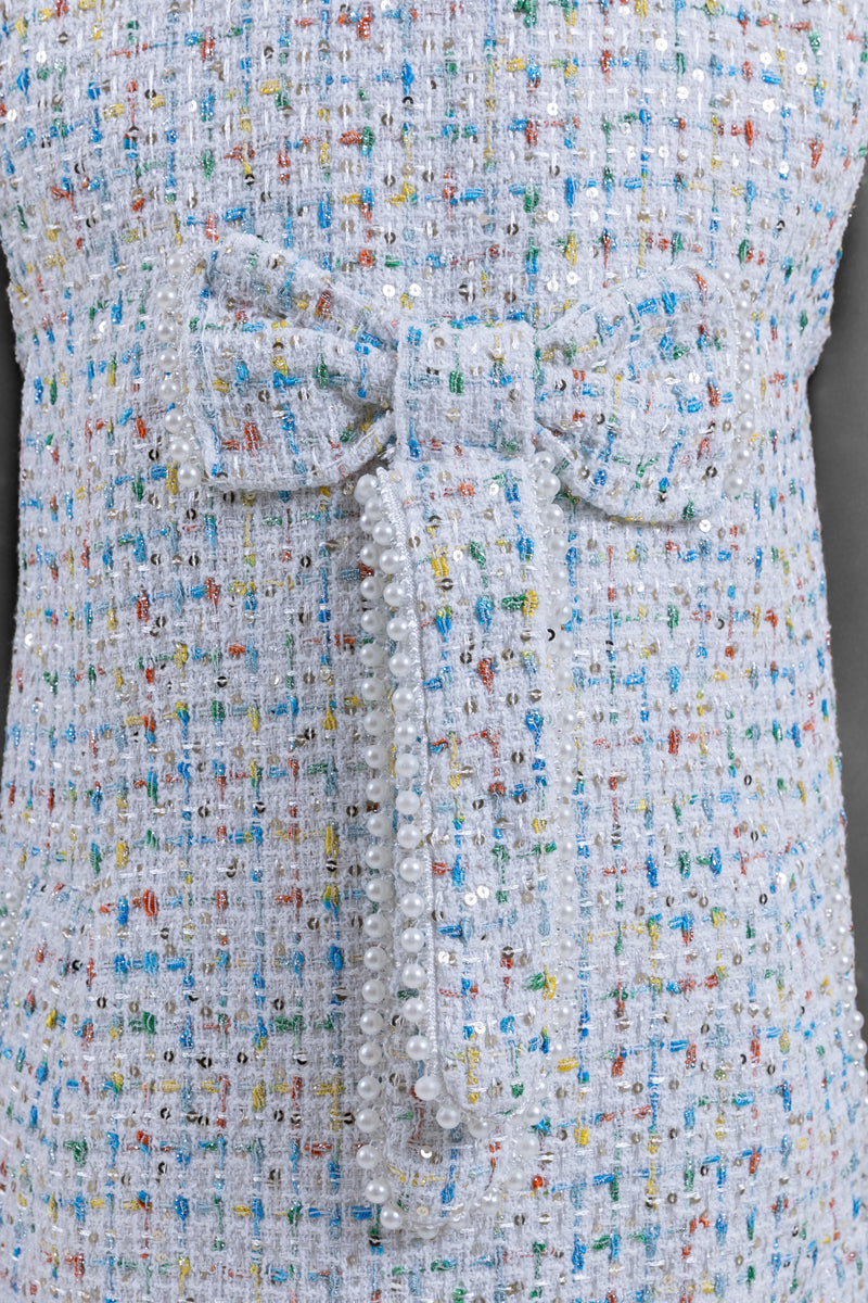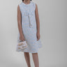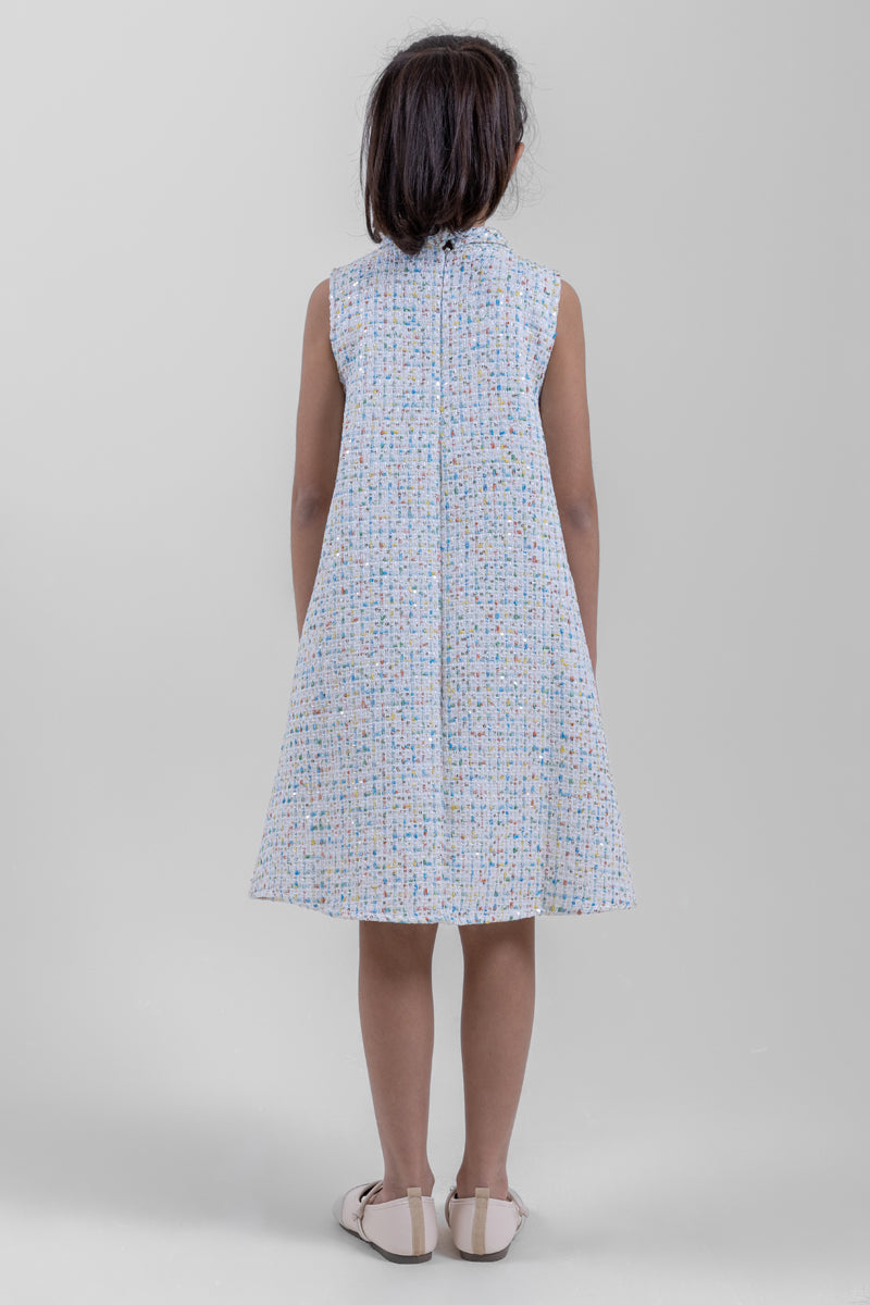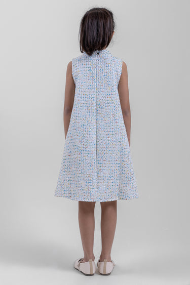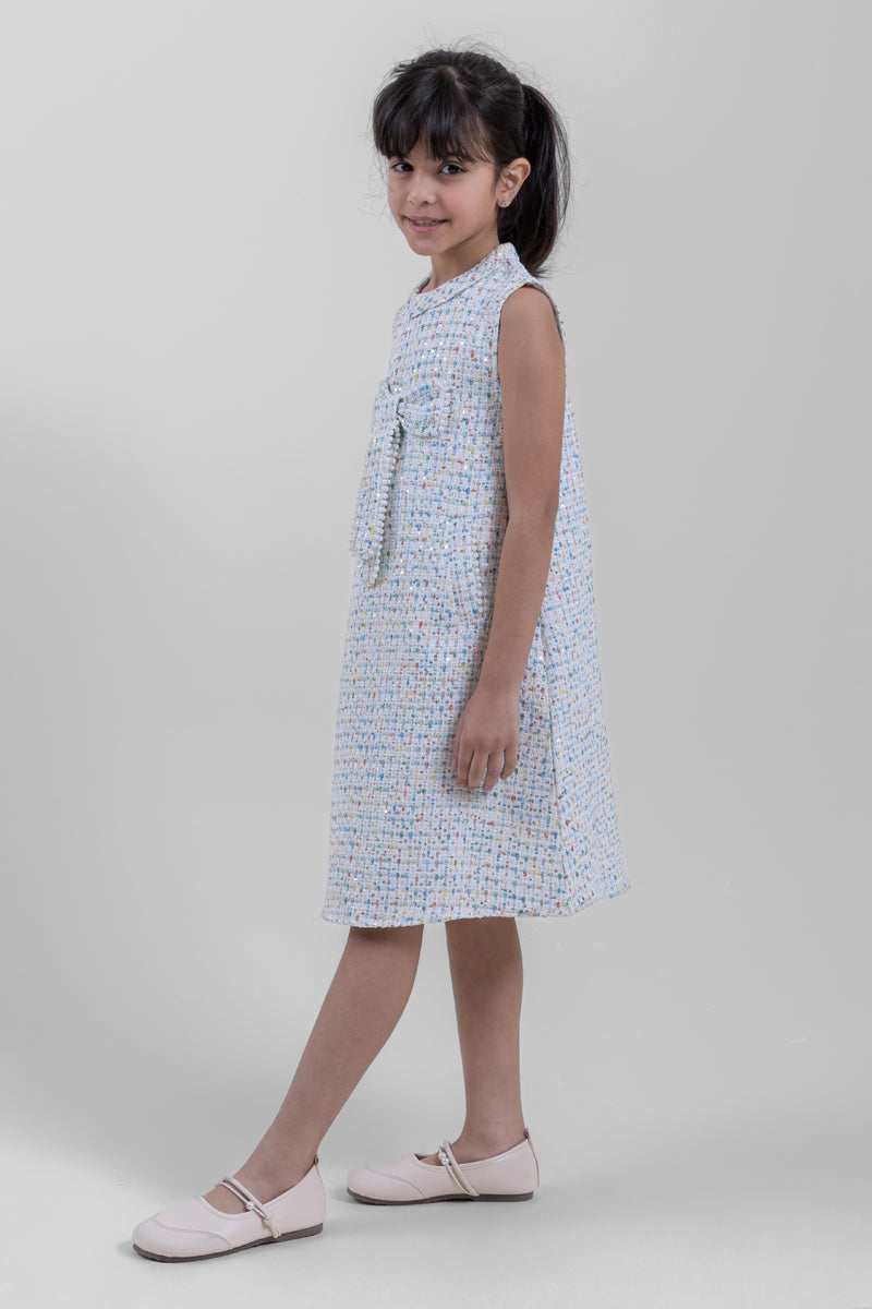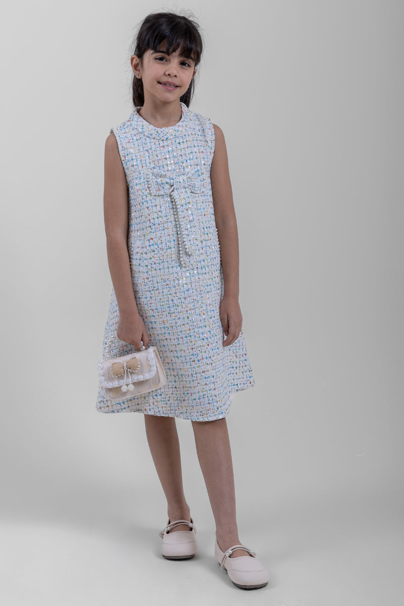 فستان بناتي أنيق بدون أكمام مصنوع من قماش محبب مع تفاصيل لونية دقيقة تمنحه مظهراً راقياً. يأتي بقصة مستقيمة مريحة مع تفصيل عقدة زخرفية في الأمام وإغلاق خلفي لسهولة الارتداء. مناسب للمناسبات الخاصة، الاحتفالات، أو الإطلالات اليومية الأنيقة.