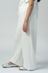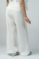 بنطلون بتصميم مريح وقصة واسعة تسمح بحرية الحركة طوال اليوم. يأتي بخصر مطاطي مع رباط قابل للتعديل لملاءمة أفضل، مع نسيج بملمس بارز يضيف لمسة مميزة دون مبالغة. مناسب للاستخدام اليومي وسهل التنسيق مع البلوزات والقطع الكاجوال.