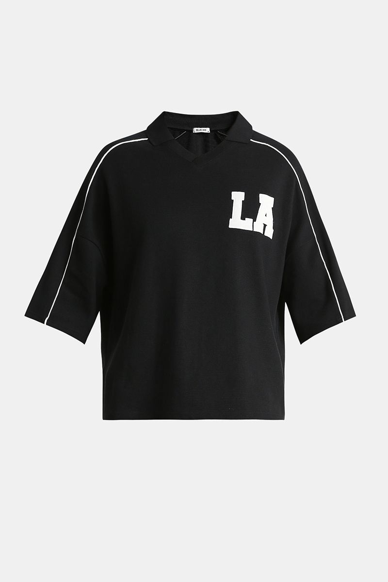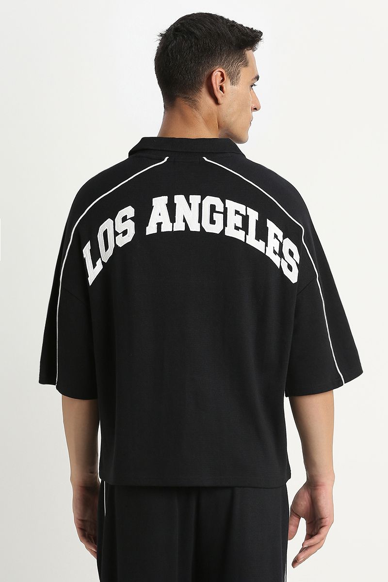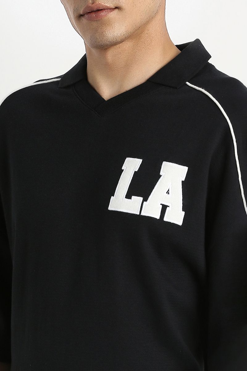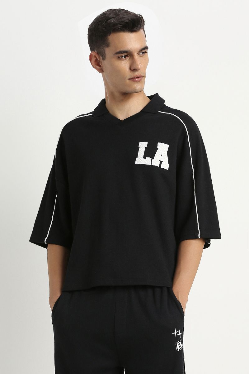 تي شيرت بولو رجالي واسع بقصة مريحة مع أكتاف ساقطة يتميز بتطريز أمامي وخلفي وخطوط متباينة على الأكمام لمظهر عصري رياضي