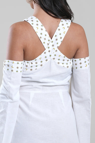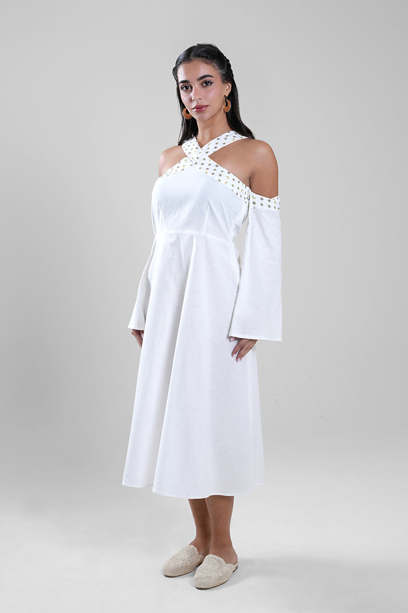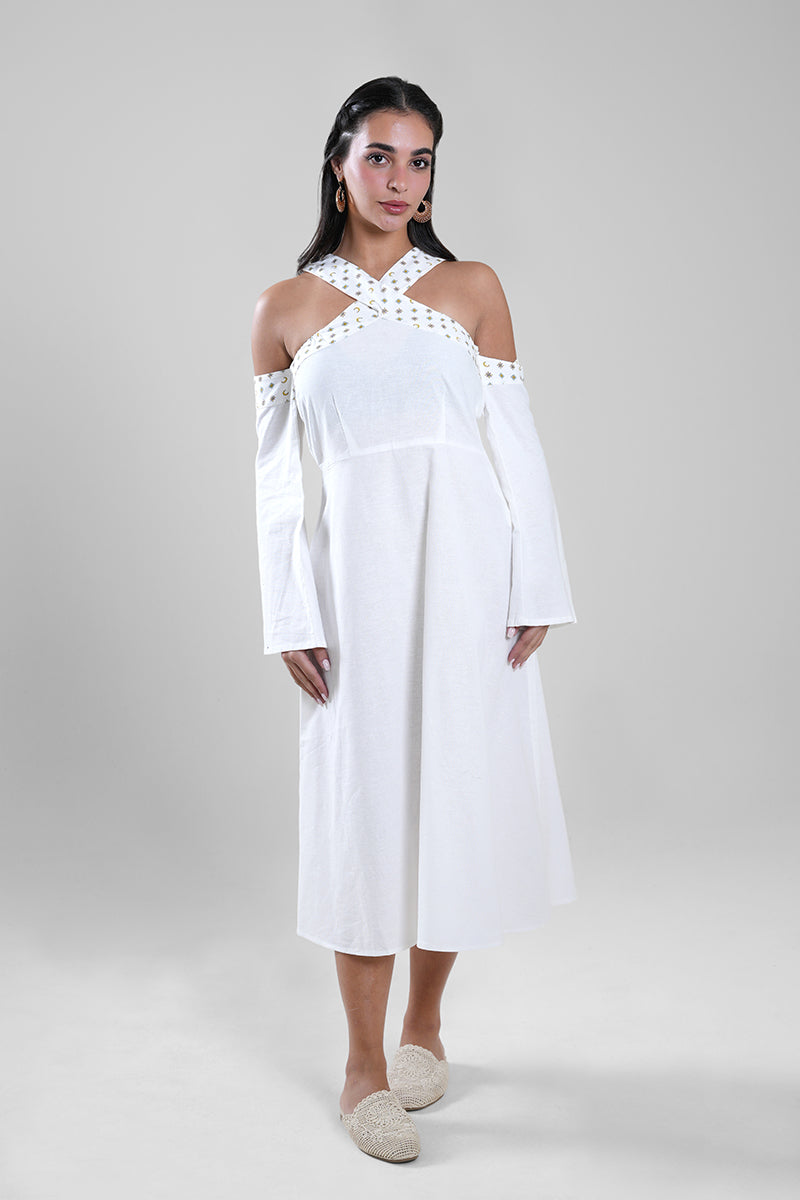 فستان بأكتاف مكشوفة وياقة متقاطعة