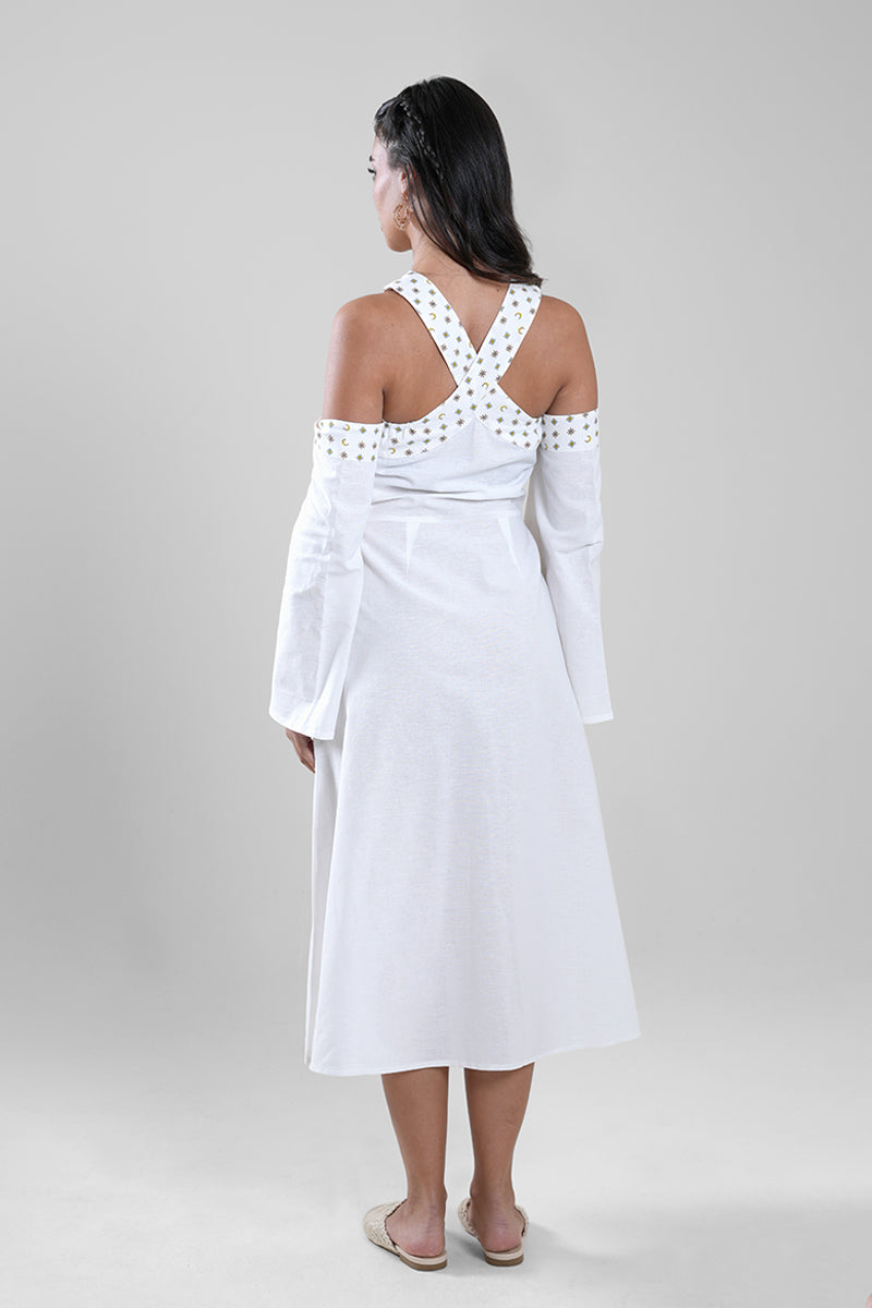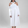 فستان نسائي طويل بتصميم أنيق يتميز بياقة متقاطعة ولمسة أكتاف مكشوفة تضيف طابعًا عصريًا متوازنًا. يأتي بأكمام طويلة وتنورة انسيابية تمنح راحة وأناقة في الحركة. مناسب للمناسبات الخاصة أو الإطلالات الراقية.