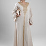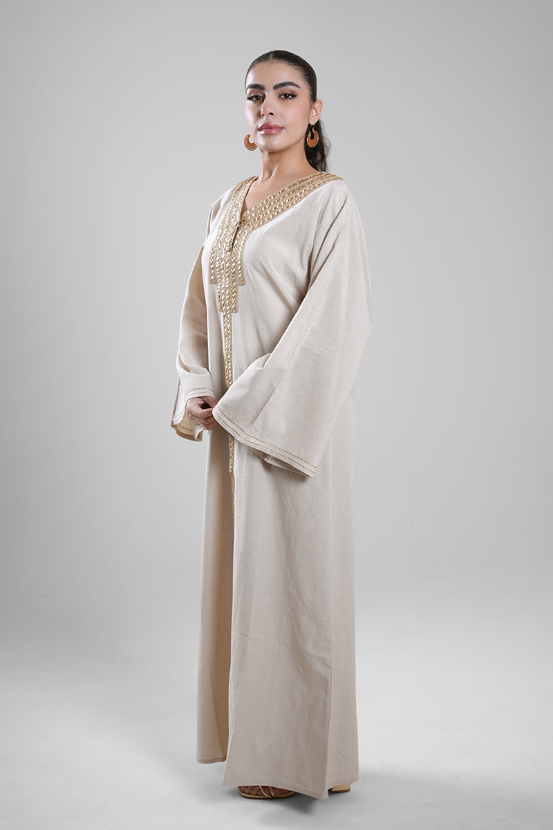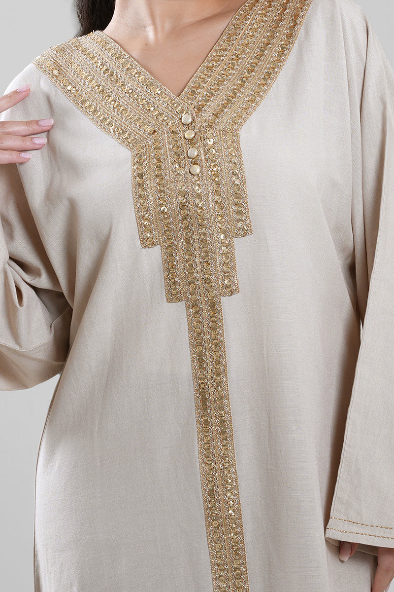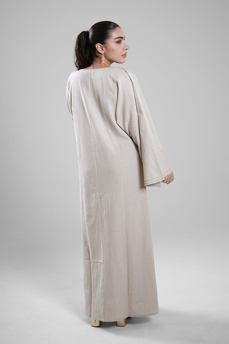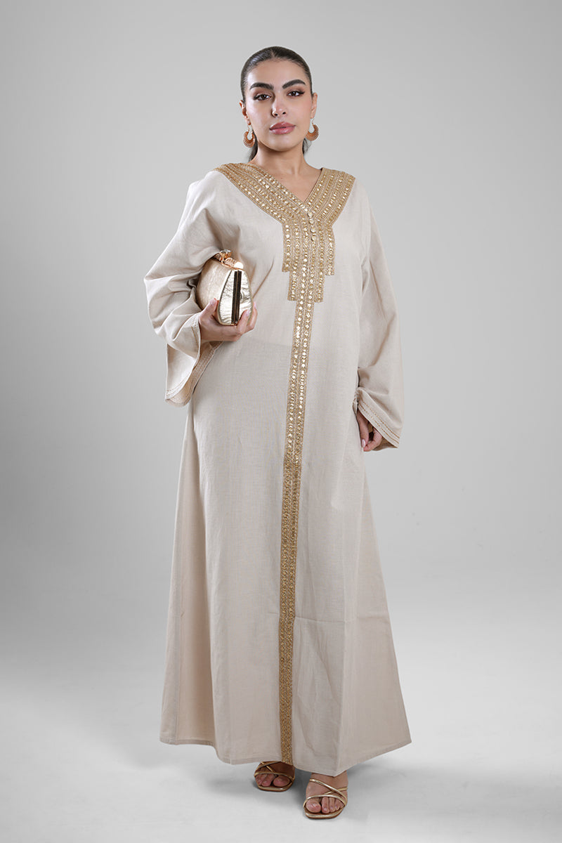 فستان نسائي طويل بقصة واسعة وانسيابية تمنح راحة وأناقة واضحة. يتميز بياقة على شكل V مزينة بتفاصيل تطريز ممتدة على طول الواجهة مع أكمام واسعة لإطلالة فخمة ومتوازنة. مناسب للمناسبات، التجمعات، أو السهرات الراقية.