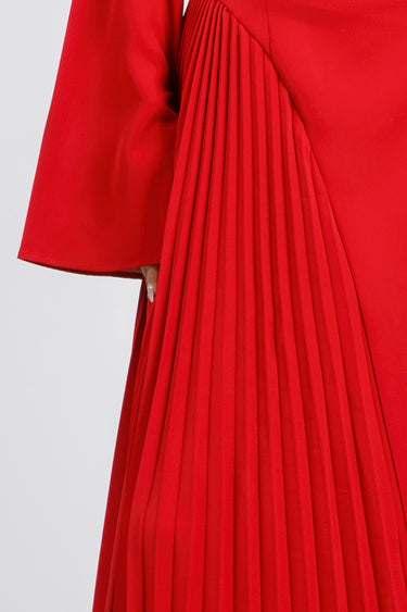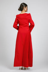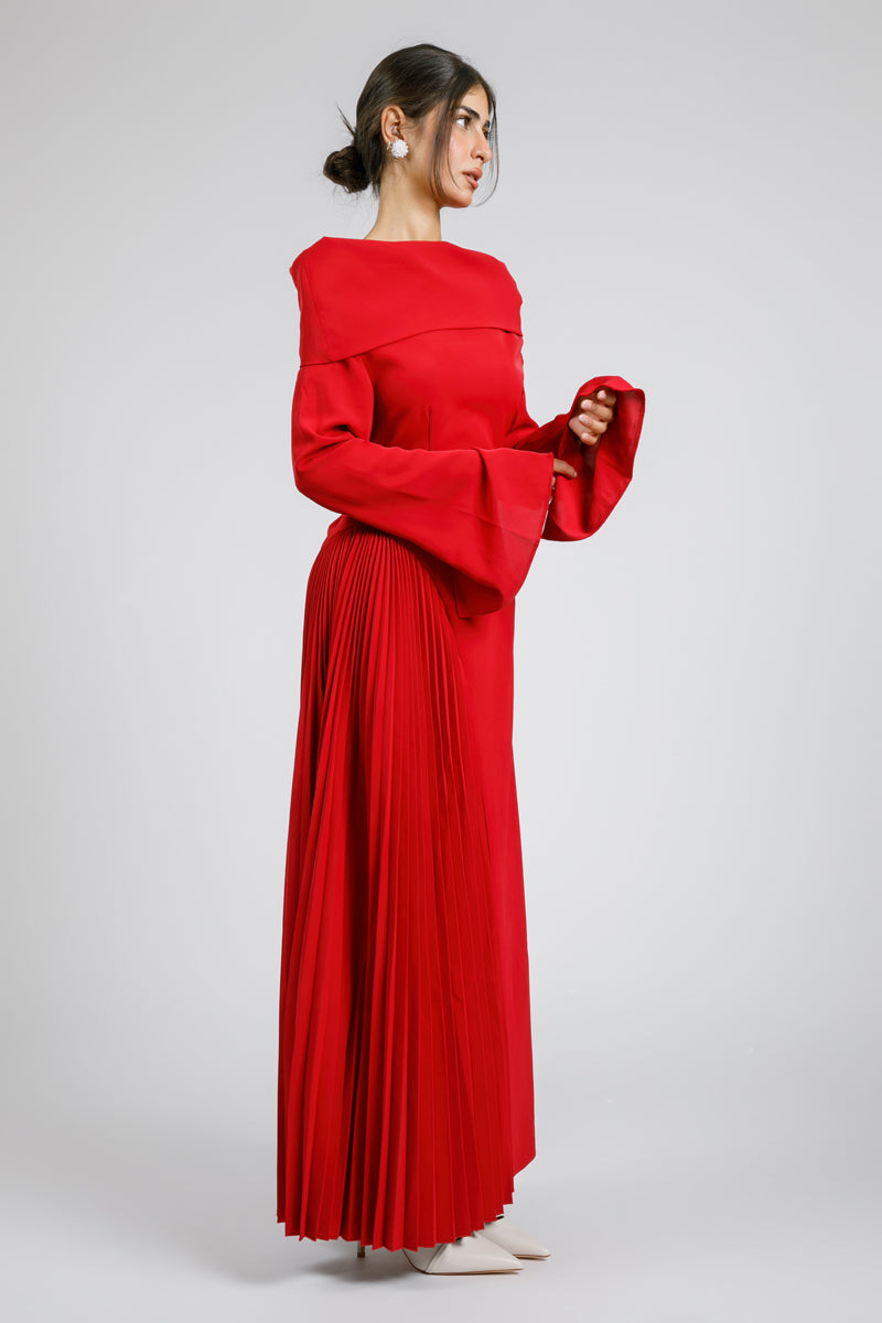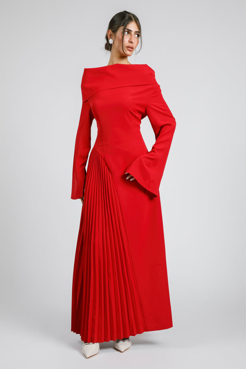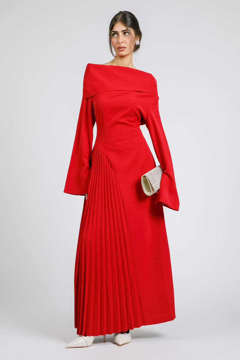 فستان ماكسي بتصميم بأكتاف مكشوفة وقصة علوية محددة تعزز الشكل الأنيق. يتميز بأكمام طويلة بأساور واسعة مع جزء مطوي جانبي يمنح حركة ولمسة عصرية للتصميم. قطعة لافتة تناسب المناسبات الرسمية والسهرات بإطلالة مميزة.