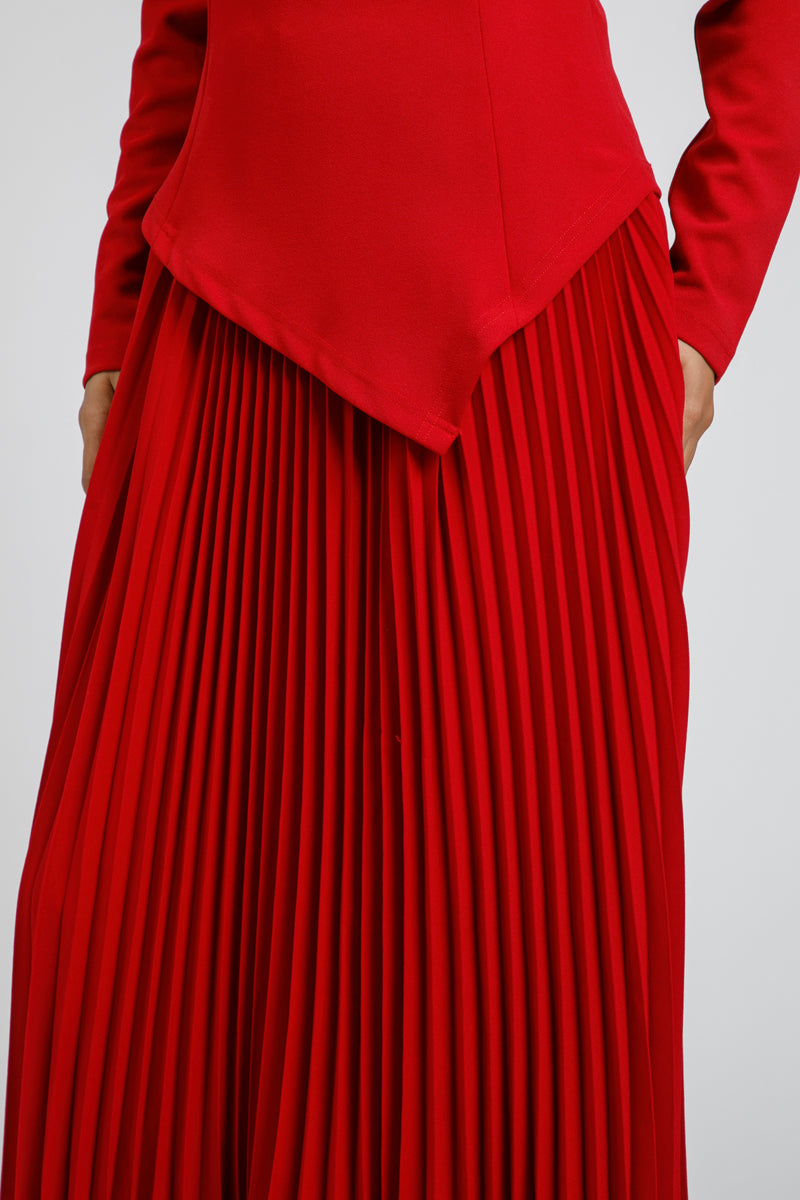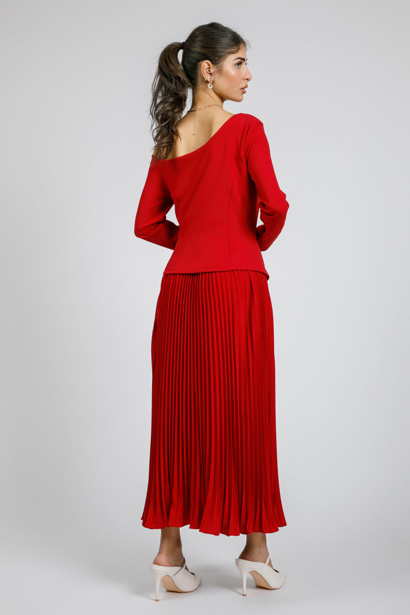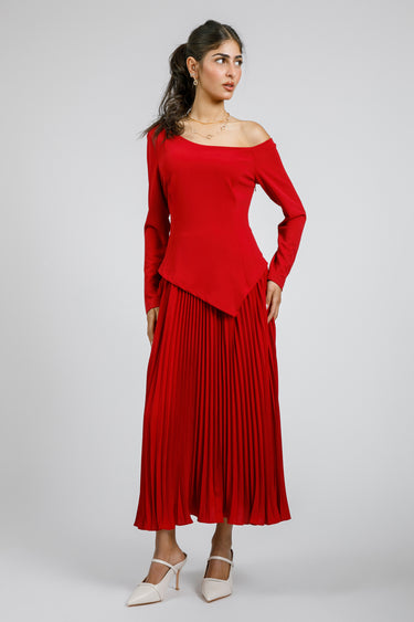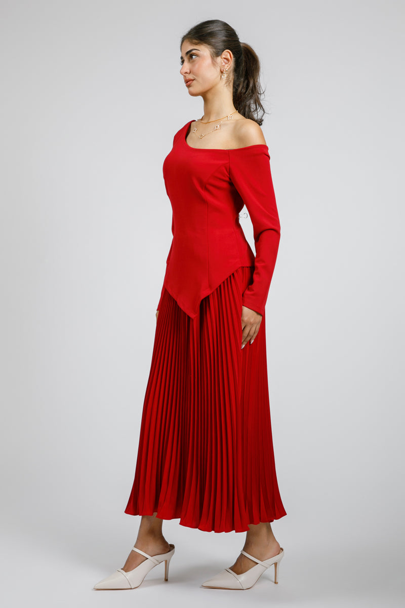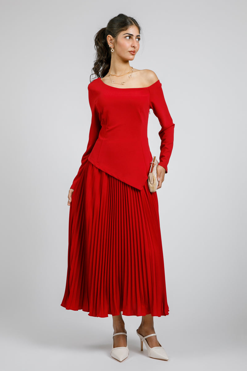 فستان بتصميم كتف مكشوف وأكمام طويلة بقصة محددة تبرز القوام. يتميز بجزء علوي بقصة غير متماثلة ينساب إلى تنورة بكسرات تمنح حركة أنيقة وانسيابية. تصميم يجمع بين الطابع العصري والأنوثة الكلاسيكية، مناسب للمناسبات والإطلالات الرسمية.
