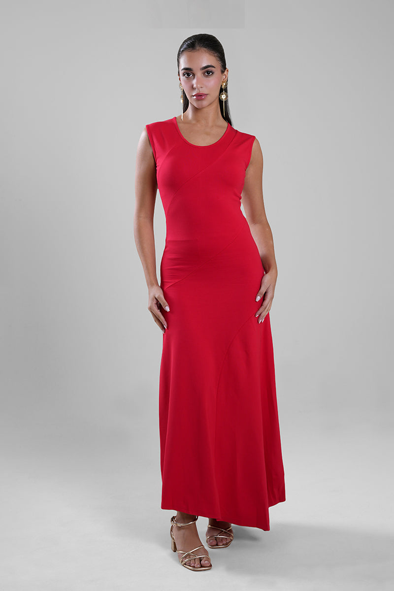 فستان نسائي طويل بدون أكمام يتميز بقصة انسيابية وخياطات دقيقة تبرز القوام بشكل متوازن. يأتي بياقة دائرية وتصميم ناعم يمنح إطلالة أنيقة ومرتبة. مناسب للمناسبات الرسمية، السهرات، أو الإطلالات الراقية ذات الطابع البسيط.
