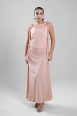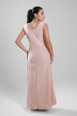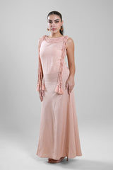 فستان نسائي طويل بدون أكمام بقصة انسيابية تعكس طول القوام مع انثناءات ناعمة. يتميز بتفاصيل شرّابات زخرفية على الياقة والجوانب تضيف لمسة أنيقة دون مبالغة. مناسب للمناسبات النهارية، التجمعات، أو الإطلالات المسائية الهادئة.