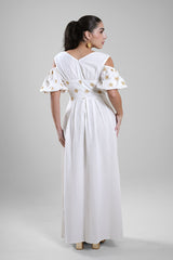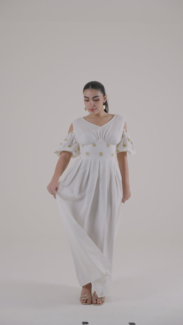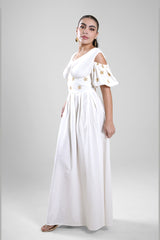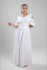 فستان نسائي طويل بتصميم انسيابي وقصة تبرز الخصر بشكل متوازن وأنيق. يتميز بأكمام بأكتاف مفتوحة مع تفاصيل ناعمة وتنورة طويلة بحركة خفيفة تمنح راحة وأناقة في آن واحد. مناسب للإطلالات اليومية، المناسبات، أو السهرات الهادئة.