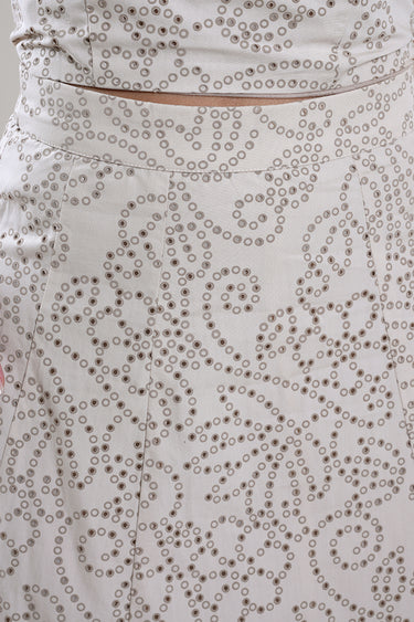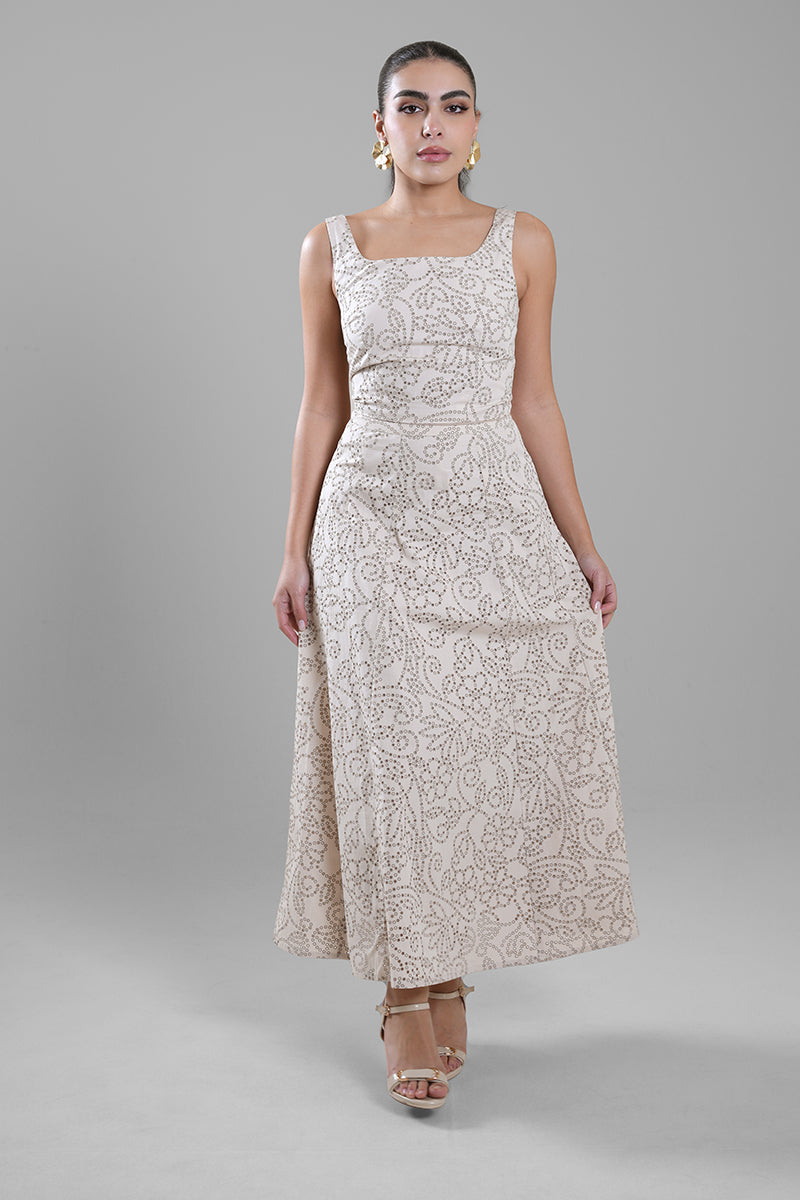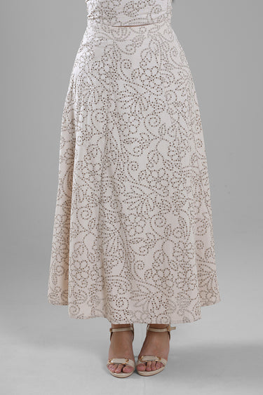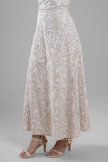 تنورة نسائية طويلة بتصميم انسيابي مزين بنقشة من الترتر تضيف لمسة لامعة وأنيقة. تأتي بقصة مريحة عند الخصر مع انسياب ناعم يمنح حركة جذابة عند الارتداء. مناسبة لإطلالات السهرة، المناسبات الخاصة، أو التنسيقات الراقية.