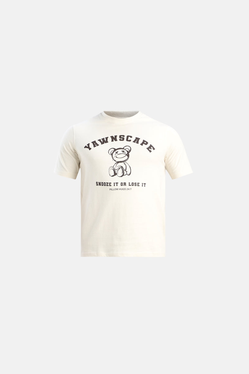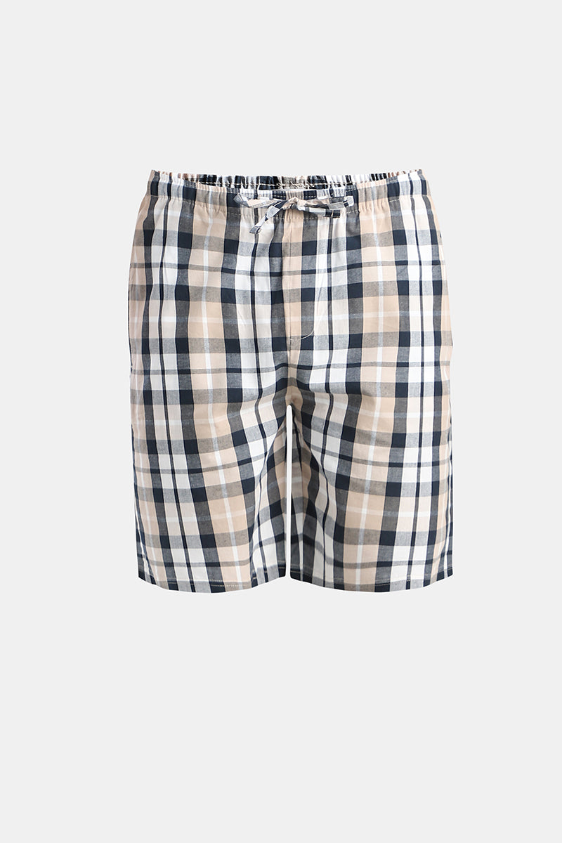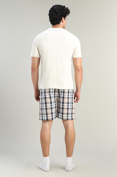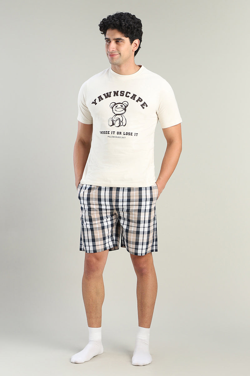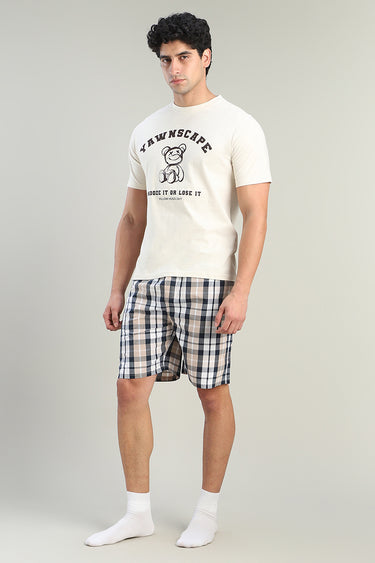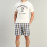 طقم ملابس منزلية رجالي مكون من تيشيرت بتصميم مطبوع وشورت بنقشة كاروهات مع خصر مطاطي وقصة مريحة وخامة خفيفة مناسب للراحة المنزلية والاستخدام اليومي