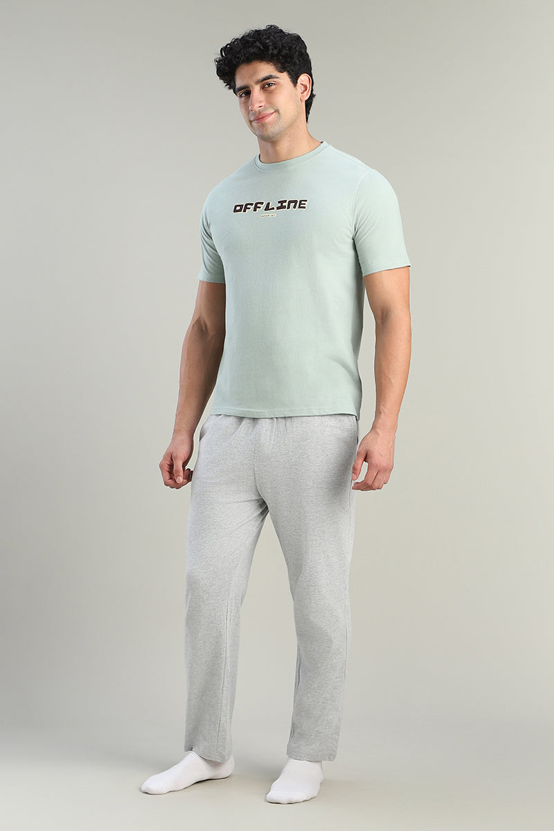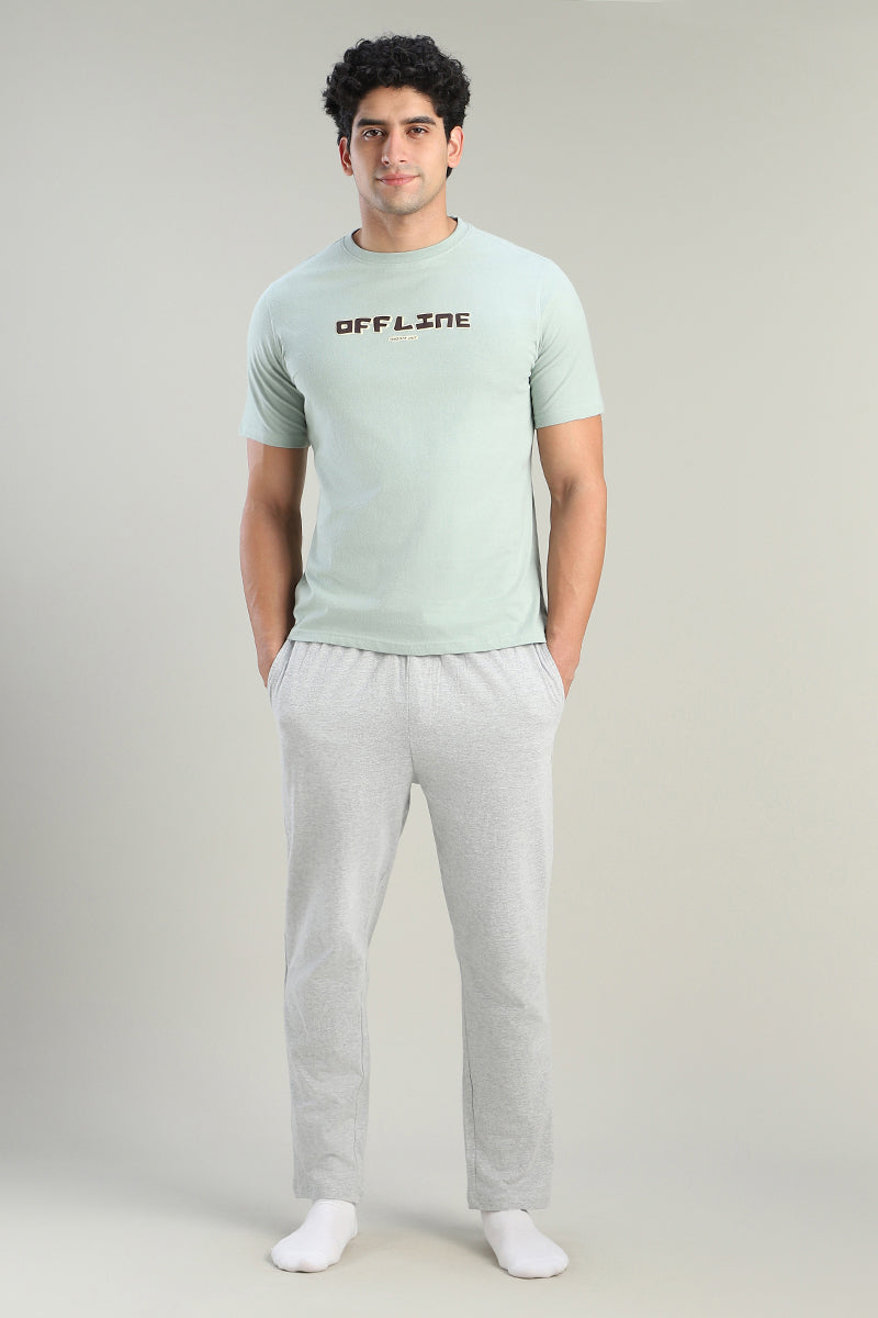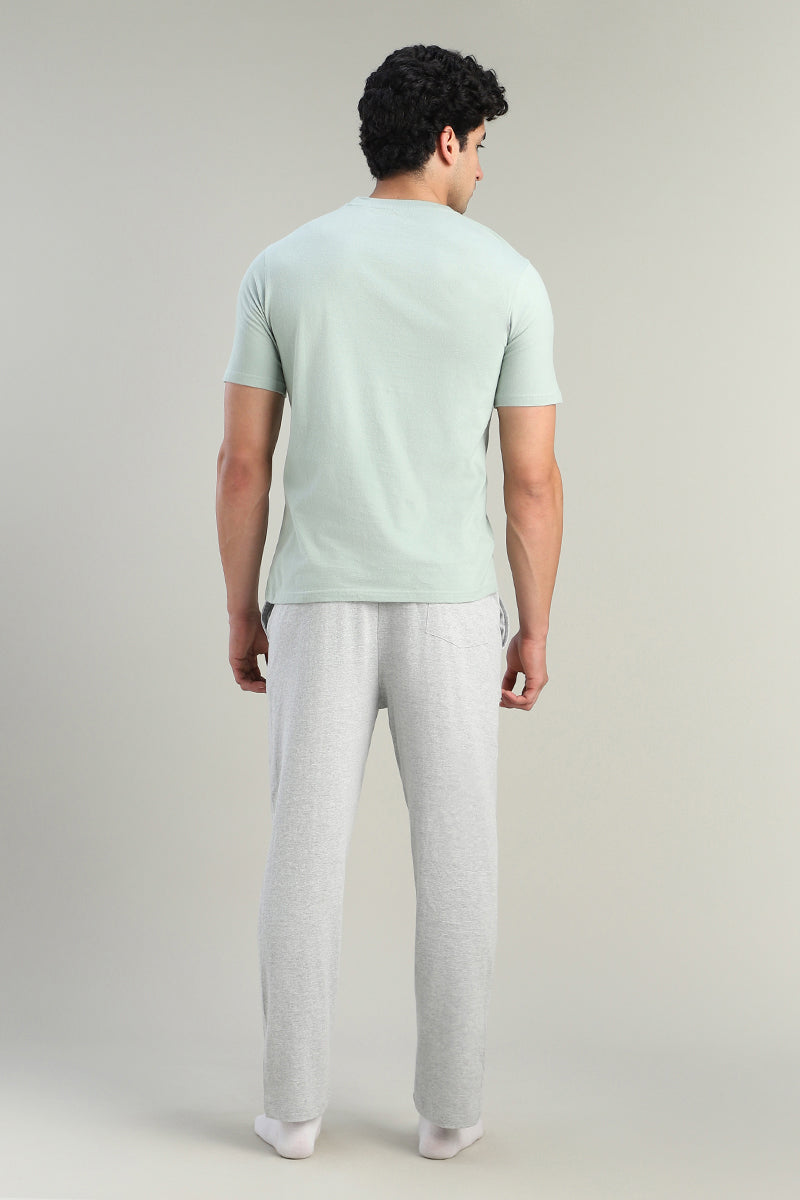 طقم ملابس منزلية رجالي يتكون من تيشيرت بتفاصيل مطبوعة وبنطلون رياضي بخصر مطاطي وقصة مريحة وخامة مريحة مناسب للاستخدام اليومي والراحة المنزلية