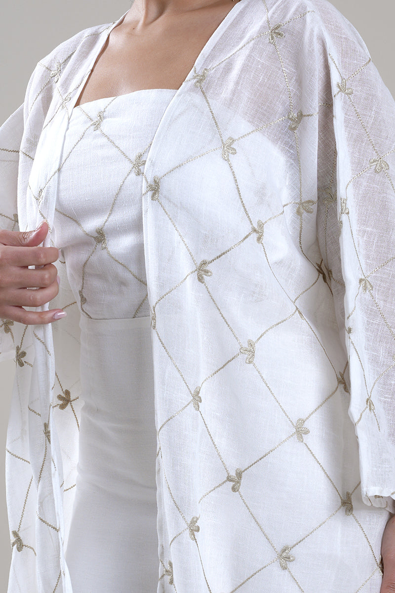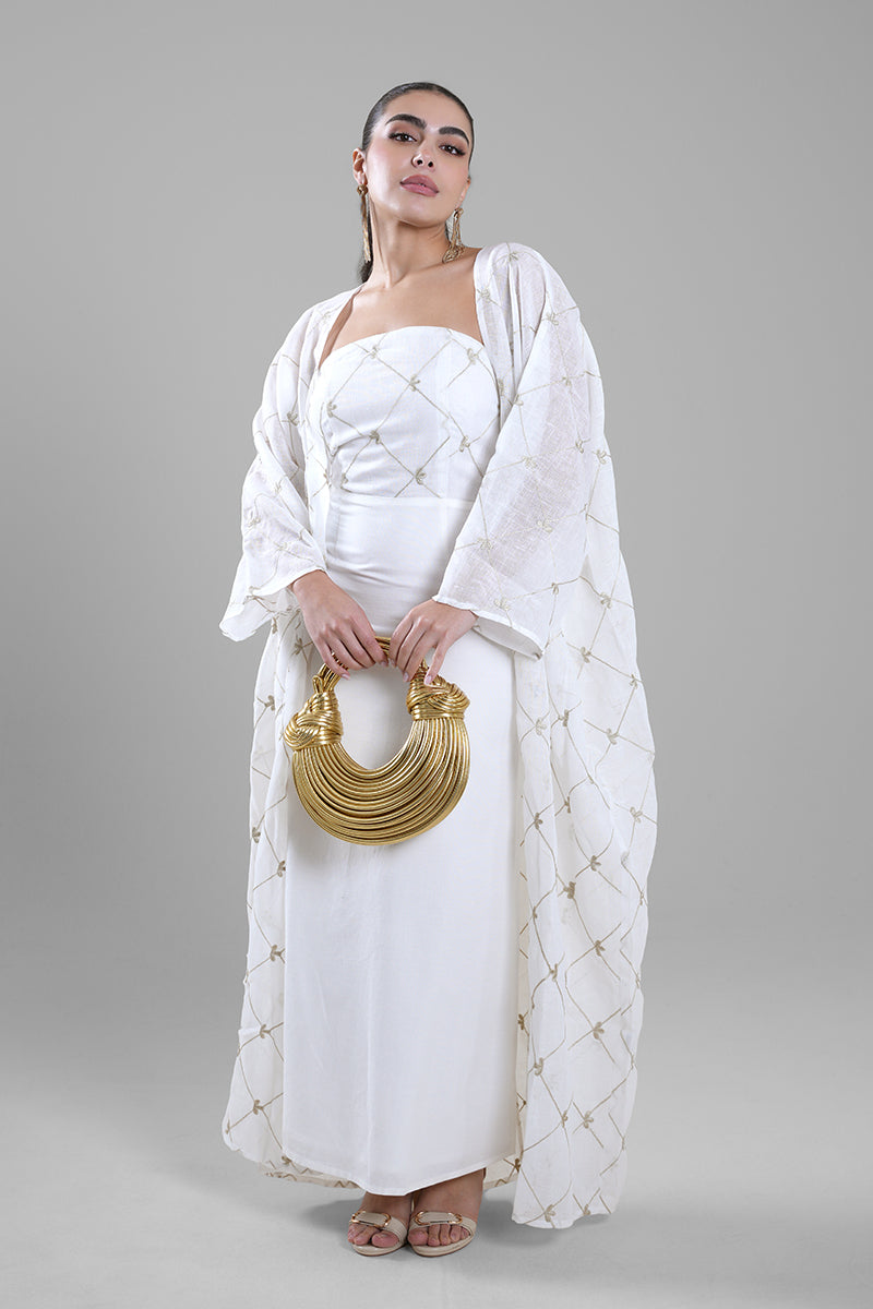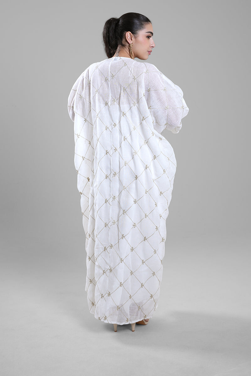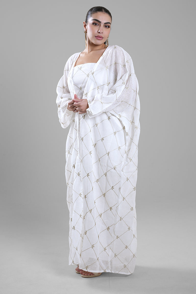عباية نسائية أنيقة مصممة من قماش خفيف مزين بتطريز راقٍ ينسدل بانسيابية على الجسم. تتميز بقصة واسعة وتفاصيل ناعمة تمنح إطلالة فخمة ومتوازنة، مناسبة للمناسبات الرسمية، السهرات، والإطلالات الراقية. تصميم بسيط يبرز جمال التطريز ويحافظ على طابع أنيق خالد.