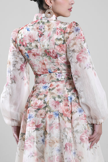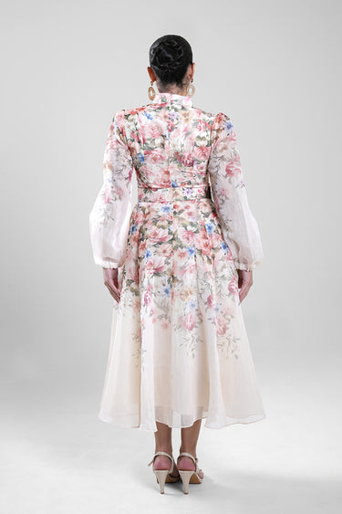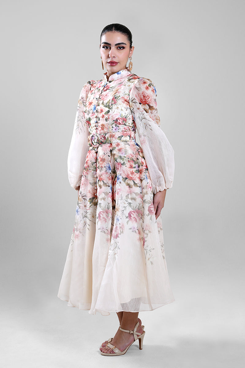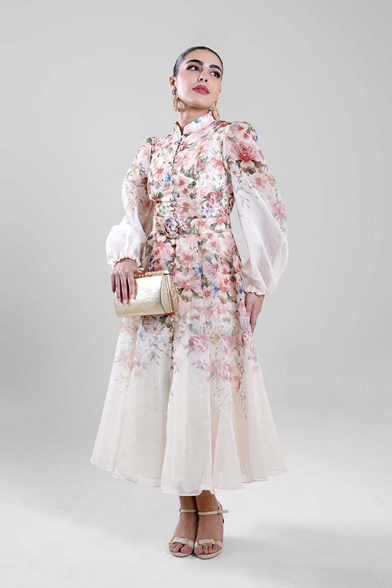 فستان نسائي طويل بتصميم انسيابي مصنوع من قماش الشيفون الخفيف والمزين بنقشة زهرية ناعمة. يتميز بياقة مرتفعة، خصر محدد بحزام متناسق، وأكمام طويلة شفافة تضيف لمسة أنثوية راقية. الطول الممتد يمنح إطلالة أنيقة ومناسبة للمناسبات النهارية واللقاءات الراقية.