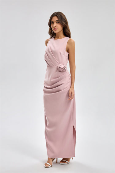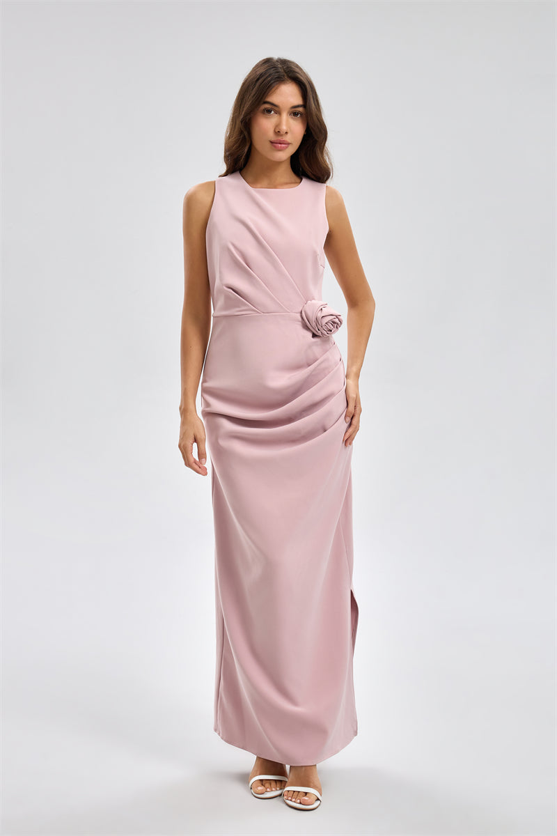 فستان نسائي طويل بدون أكمام بتفاصيل منسدلة أنيقة على الصدر والخصر يمنح قصة انسيابية ومظهرا راقيا تصميم قطعة واحدة بقص مستقيم مع طيات ناعمة لملاءمة جميلة مناسب للمناسبات الرسمية والسهرات واللقاءات الخاصة خيار أنيق ينسجم مع ذوق المرأة السعودية