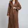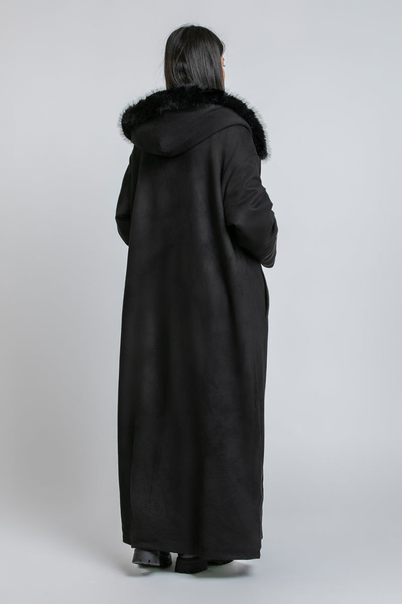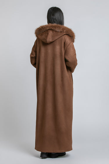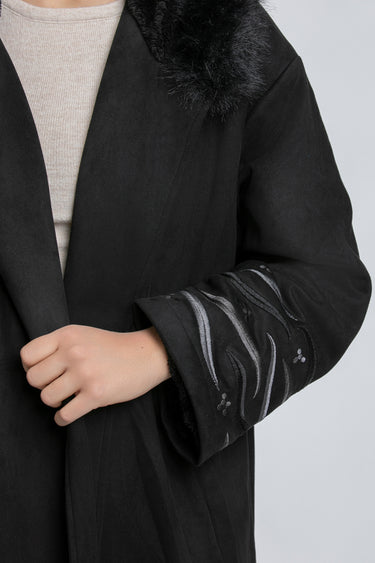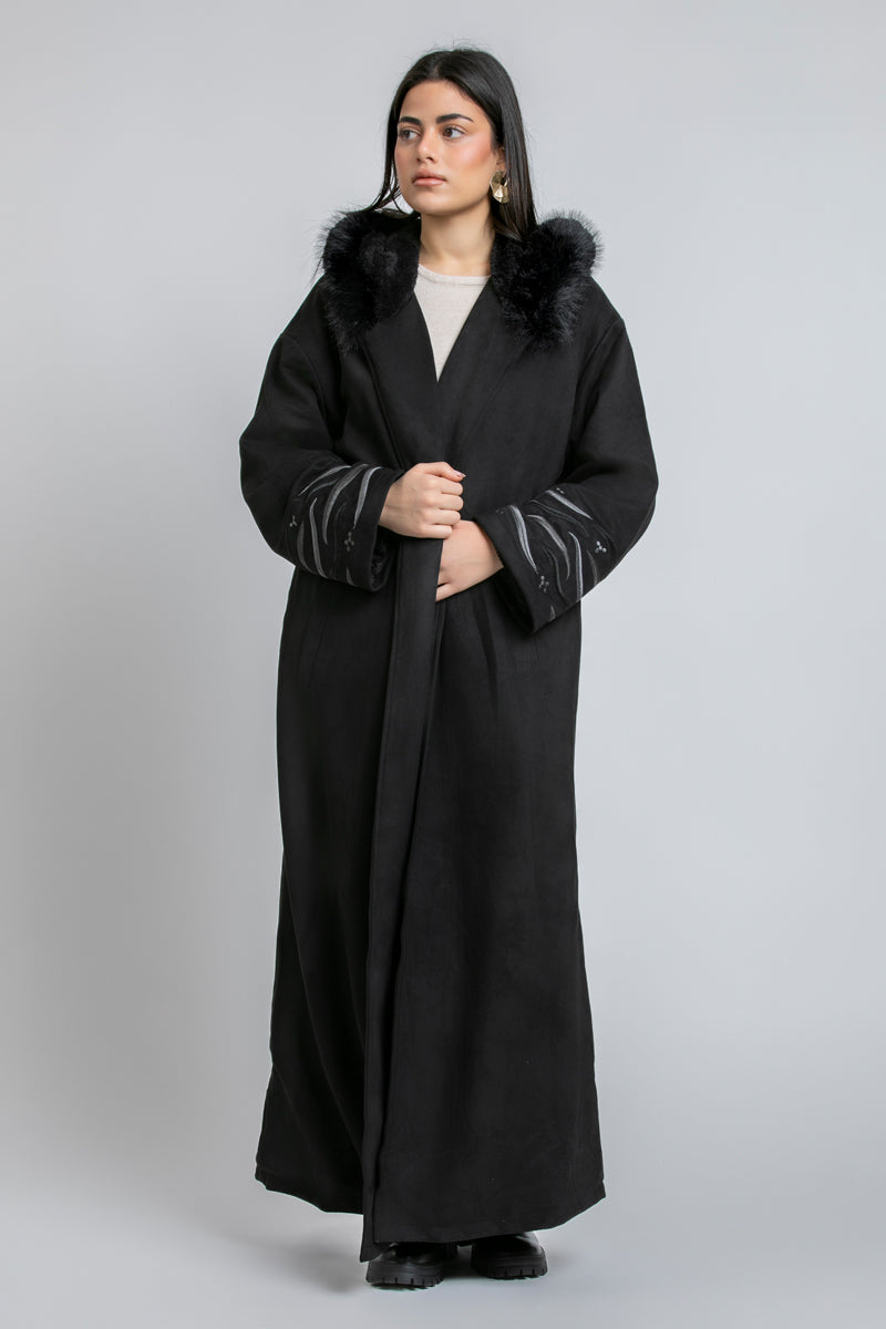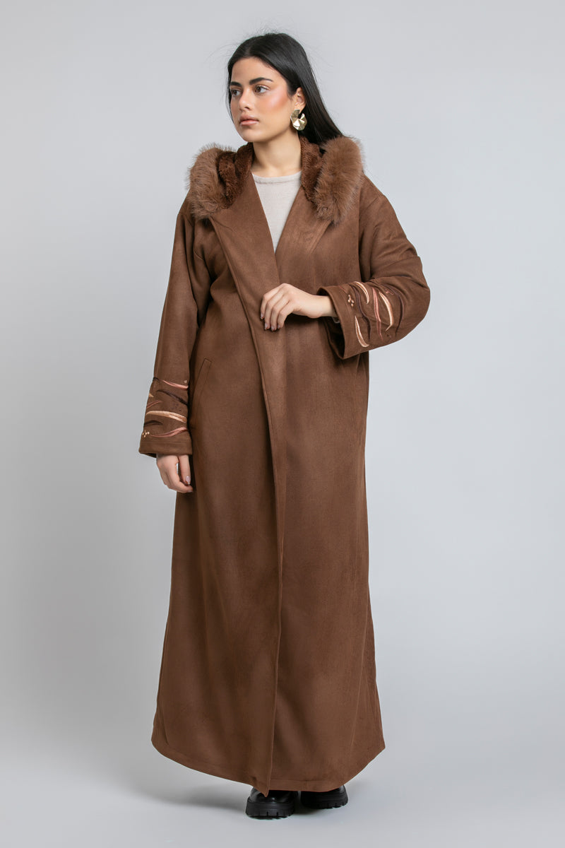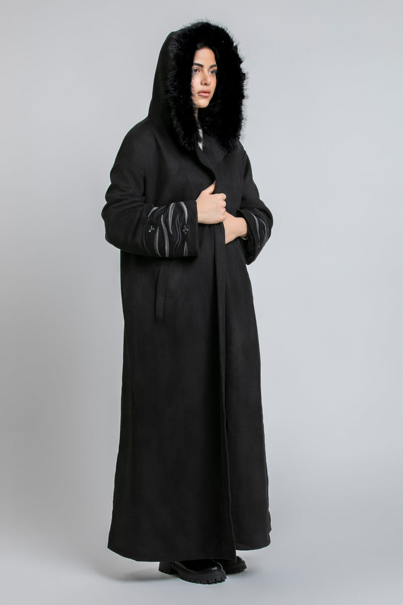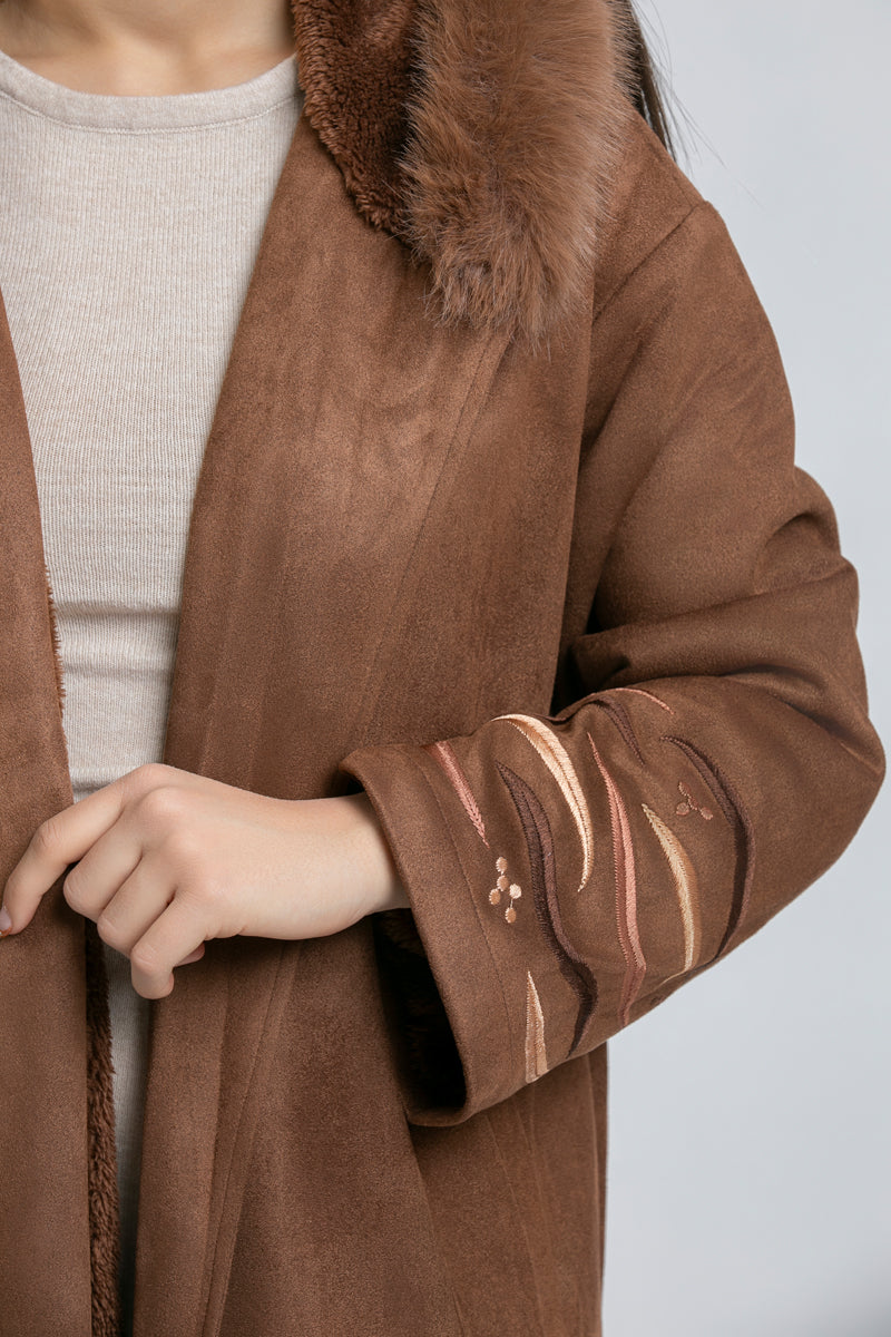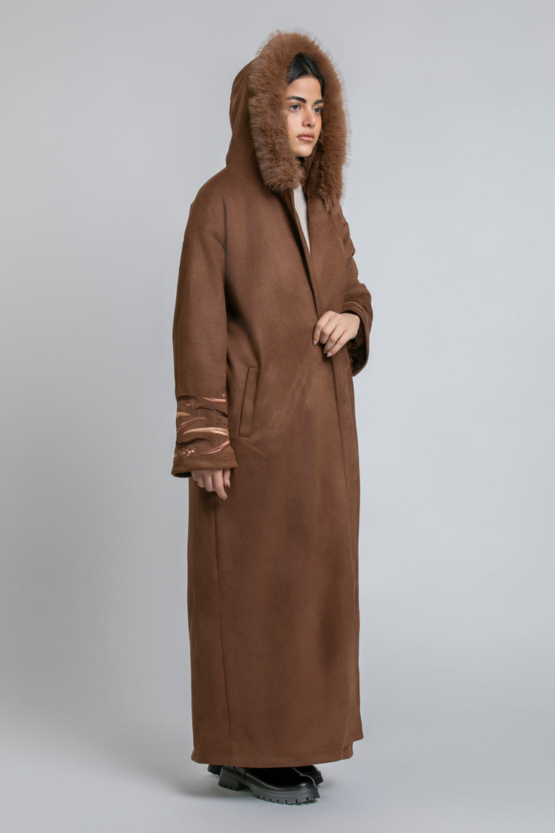 فروة طويلة بقصّة دافئة ومنسدلة، تأتي بقبعة مزيّنة بفرو اصطناعي لمظهر شتوي مميز. تتميّز بأكمام واسعة مع تطريزات ناعمة ولمسة فاخرة، وتصميم مفتوح من الأمام لإطلالة عملية وأنيقة.