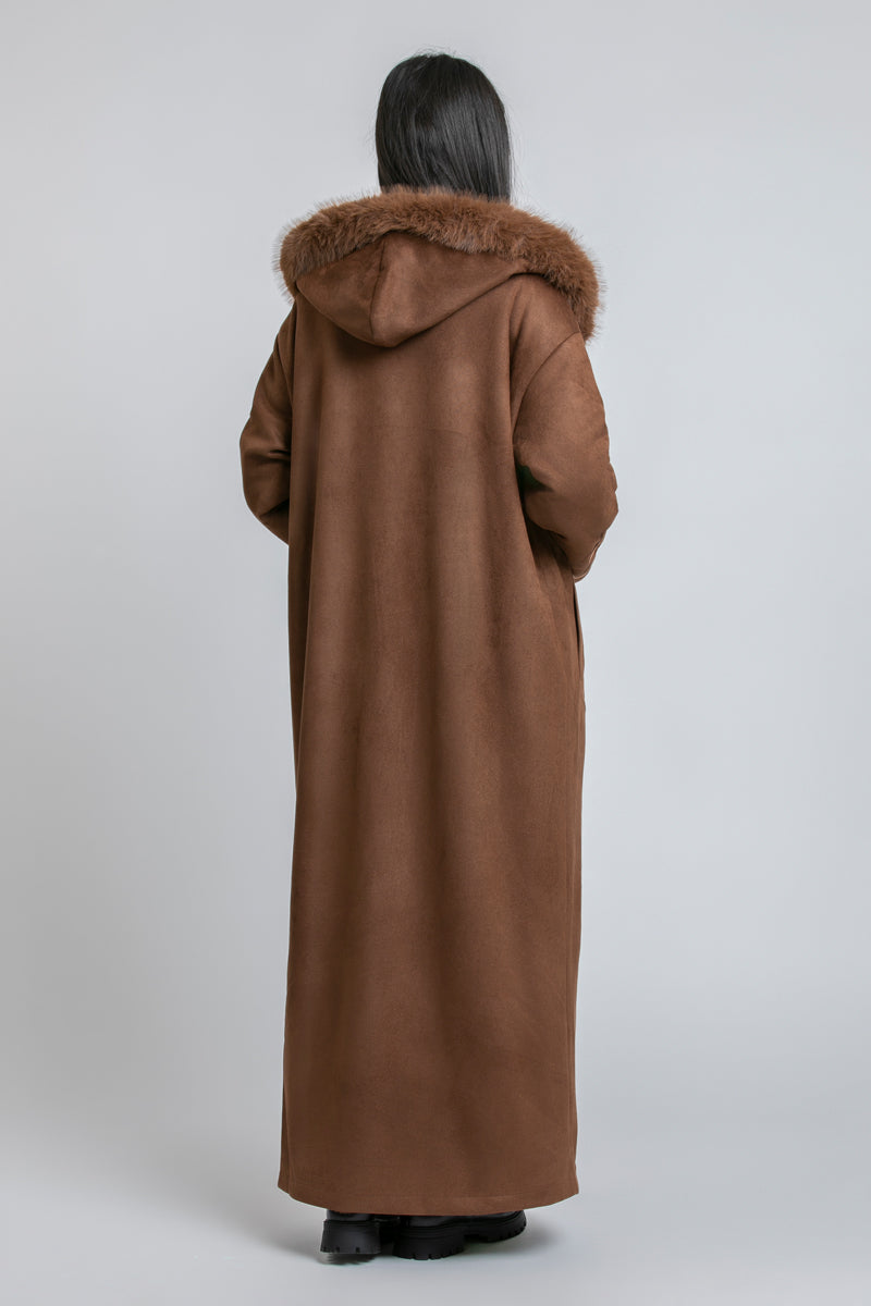 فروة طويلة بقبعة وتفاصيل فرو