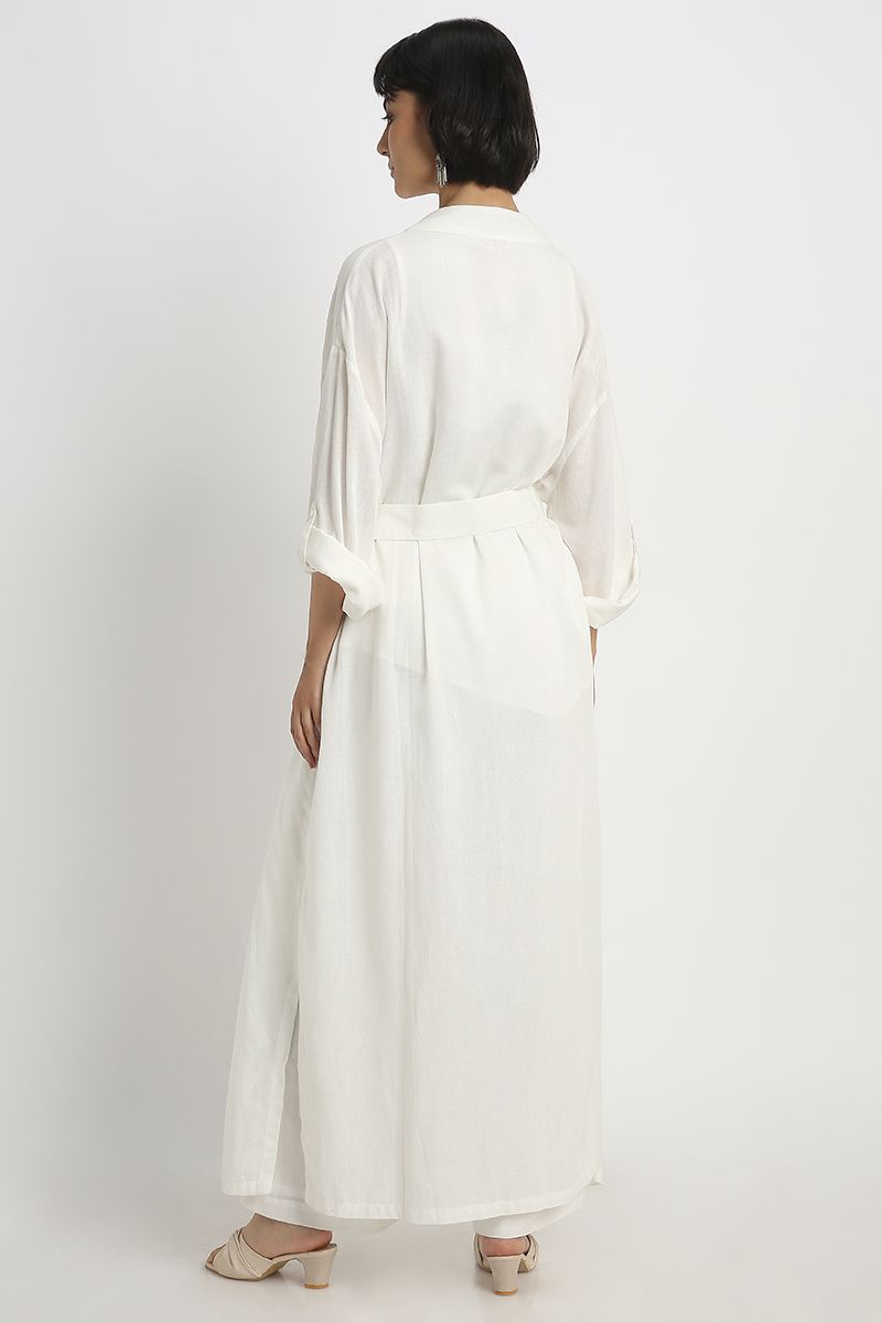 طبقات أنيقة مع لمسة عصرية. جاكيت قميص نسائي بأكمام طويلة وطول ممتد، بلون سادة، مزوّد بجيوب أمامية عملية وحزام للربط على الخصر لإبراز القصة بشكل أنيق. مثالي لفصل الانتقال، يضفي لمسة متكاملة على إطلالتك مع الحفاظ على الراحة.