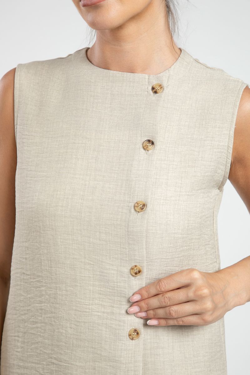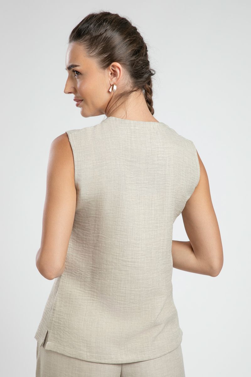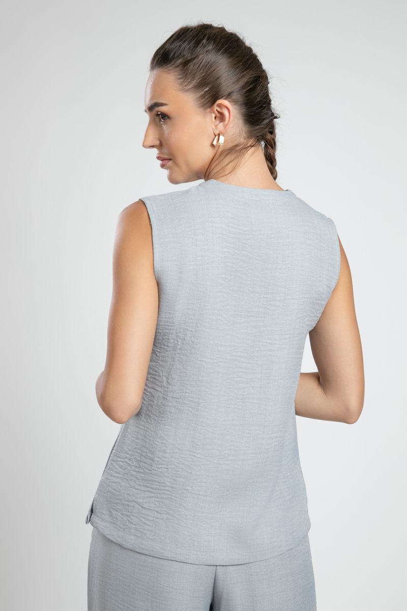 بلوزة نسائية بدون أكمام بأسلوب رسمي – بلون سادة وقماش مجعد
