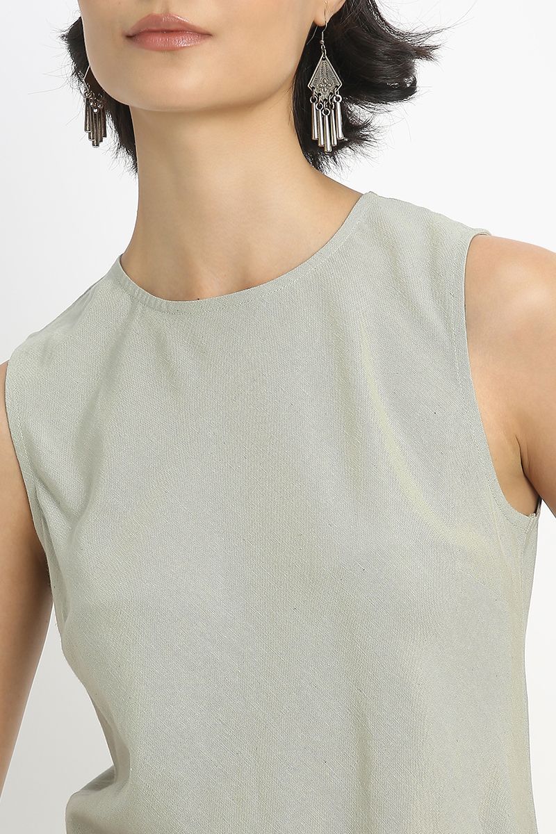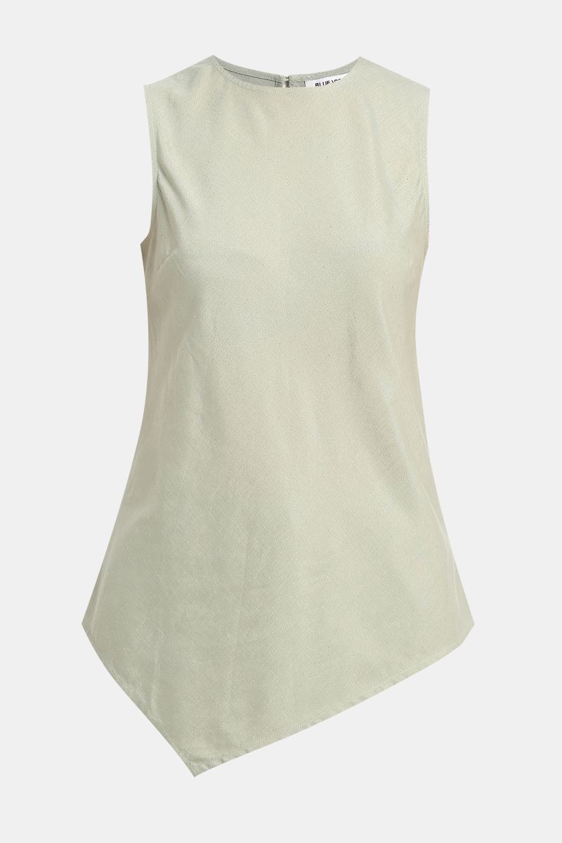 أناقة عصرية بتفاصيل فريدة. بلوزة نسائية بدون أكمام بقصة غير متماثلة ولون سادة، مع ياقة دائرية وإغلاق بأزرار من الخلف. خفيفة ومتعددة الاستخدامات، تضيف لمسة أنيقة إلى إطلالتك سواء كنتِ تفضلين الأسلوب الرسمي أو الكاجوال.