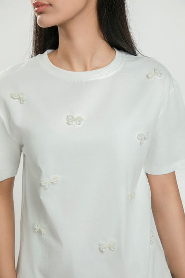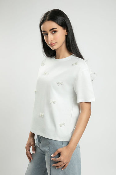 تيشيرت نسائي بأكمام قصيرة – مزين بعقد خرز على شكل فيونكات