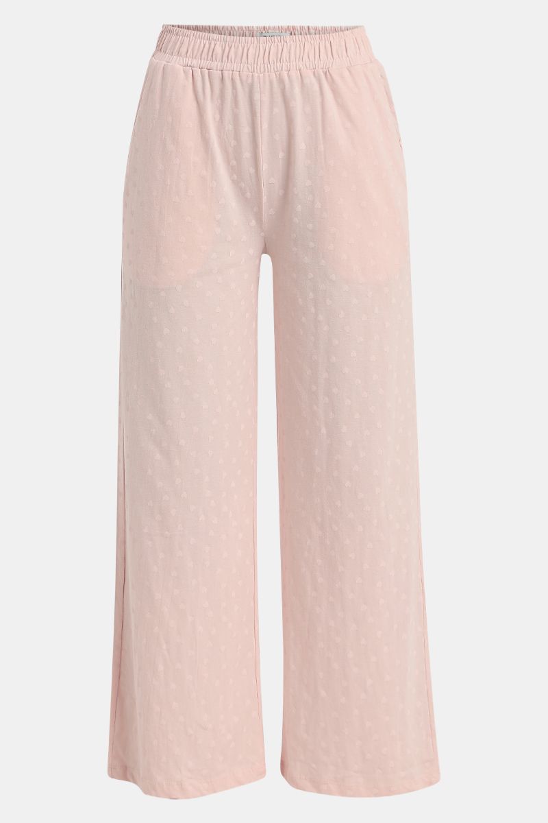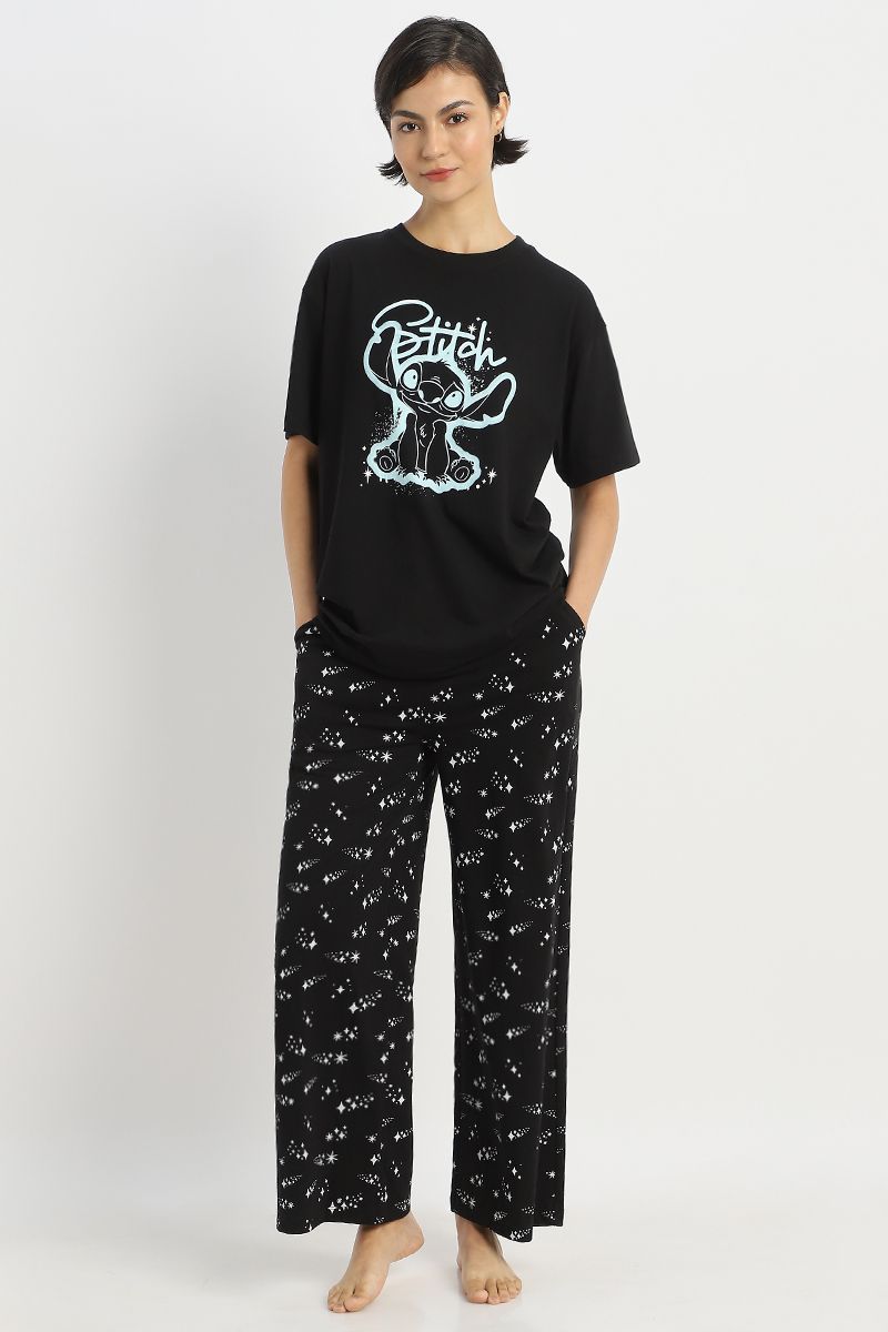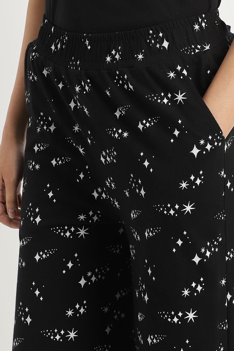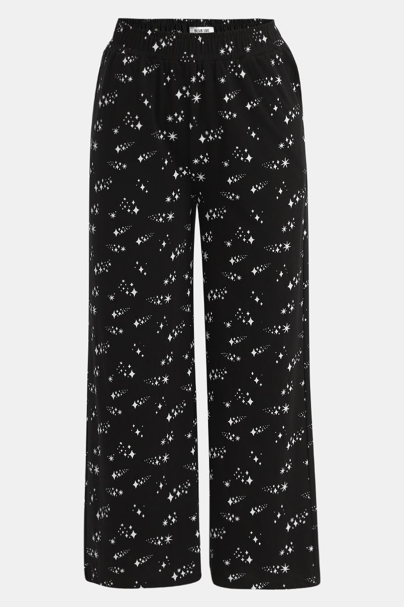 بنطال منزلي نسائي باللون الأسود مزين بطبعة نجوم بيضاء أنيقة. مصنوع من قماش ناعم مع خصر مطاطي وجيوب جانبية لمزيد من الراحة. يتميز بقصة واسعة فضفاضة، مثالي للاسترخاء أو للنوم.