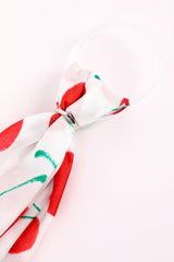 أضيفي لمسة مرحة إلى إكسسواراتك مع هذا الوشاح الأنيق المصنوع من قماش ساتان والمزين بنقشة فواكه نابضة بالحيوية ومصنوع من خامة ناعمة عالية الجودة تمنحك ملمساً فاخراً وانسيابية جميلة ويتميز بتصميم كلاسيكي مع إطار متباين يجعله قطعة متعددة الاستخدام يمكن تنسيقها حول الرقبة أو كإكسسوار للشعر أو ربطها على الحقيبة ويعد خياراً مثالياً للإطلالات اليومية وأزياء المكتب والمناسبات الخاصة كما يأتي بخفة مريحة تضيف لمسة عصرية وأنيقة إلى كل إطلالة