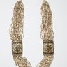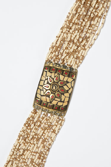 قلادة مصممة بأسلوب تراثي أنيق، تتكوّن من عدة خيوط خرزية متناسقة تتوسطها وحدات مربعة مزخرفة بتفاصيل دقيقة مستوحاة من الحِرف التقليدية. تصميم متعدد الطبقات يمنح القطعة حضورًا لافتًا وتوازناً بصرياً، مع رباط علوي قابل للتعديل لراحة أكبر عند الارتداء. مناسبة لإضفاء لمسة فنية مميزة على الإطلالات اليومية أو المسائية.