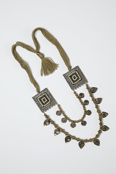 قلادة مستوحاة من الزخارف التراثية، تتكوّن من طبقتين من الخرز المعدني تتدلّى منهما عناصر زخرفية صغيرة بتفاصيل دقيقة. تتوسطها وحدات مربعة مزخرفة بتطريز خرزي يضيف عمقاً بصرياً مميزاً. مزوّدة بحبل نسيجي مع شرابة لإمكانية التعديل والراحة عند الارتداء. قطعة لافتة تضيف طابعاً فنياً لأي إطلالة.