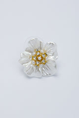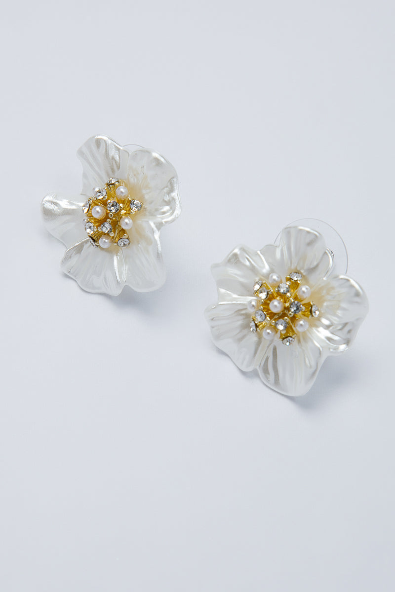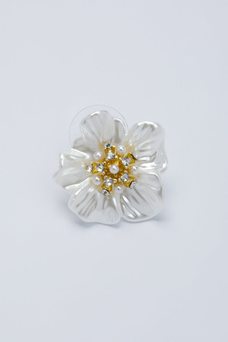 أقراط مميزة بتصميم على شكل زهرة ناعمة تتوسطها تفاصيل لؤلؤية ولمسات كريستالية رقيقة. قطعة تجمع بين الرقي والبساطة، مناسبة للإطلالات المسائية أو لإضفاء لمسة أنيقة هادئة على المظهر اليومي من دون مبالغة درامية.