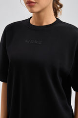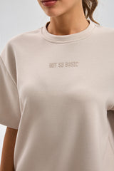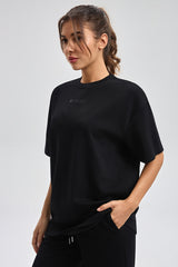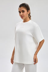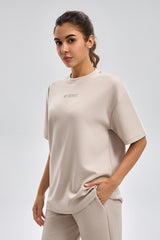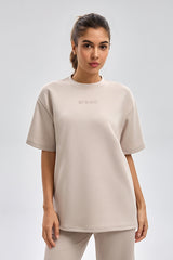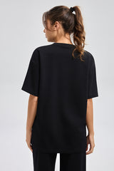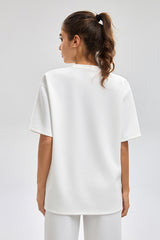 تيشيرت بقصة واسعة مع ياقة دائرية وأكمام قصيرة. تصميم بسيط مع طبعة ناعمة وملمس مريح يمنح راحة طوال اليوم ومظهر كاجوال مناسب للاستخدام اليومي