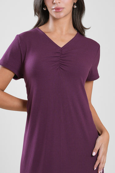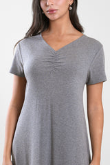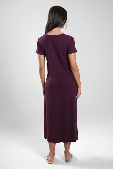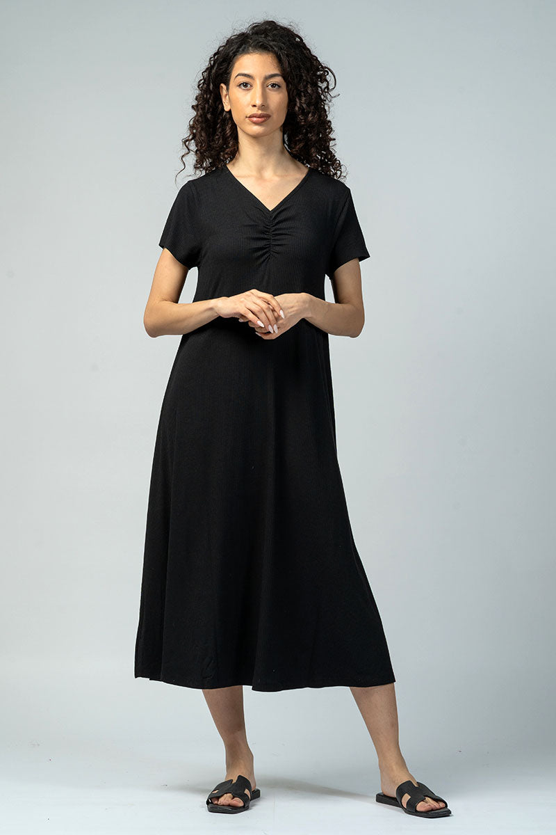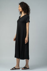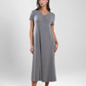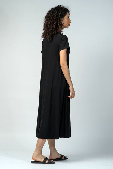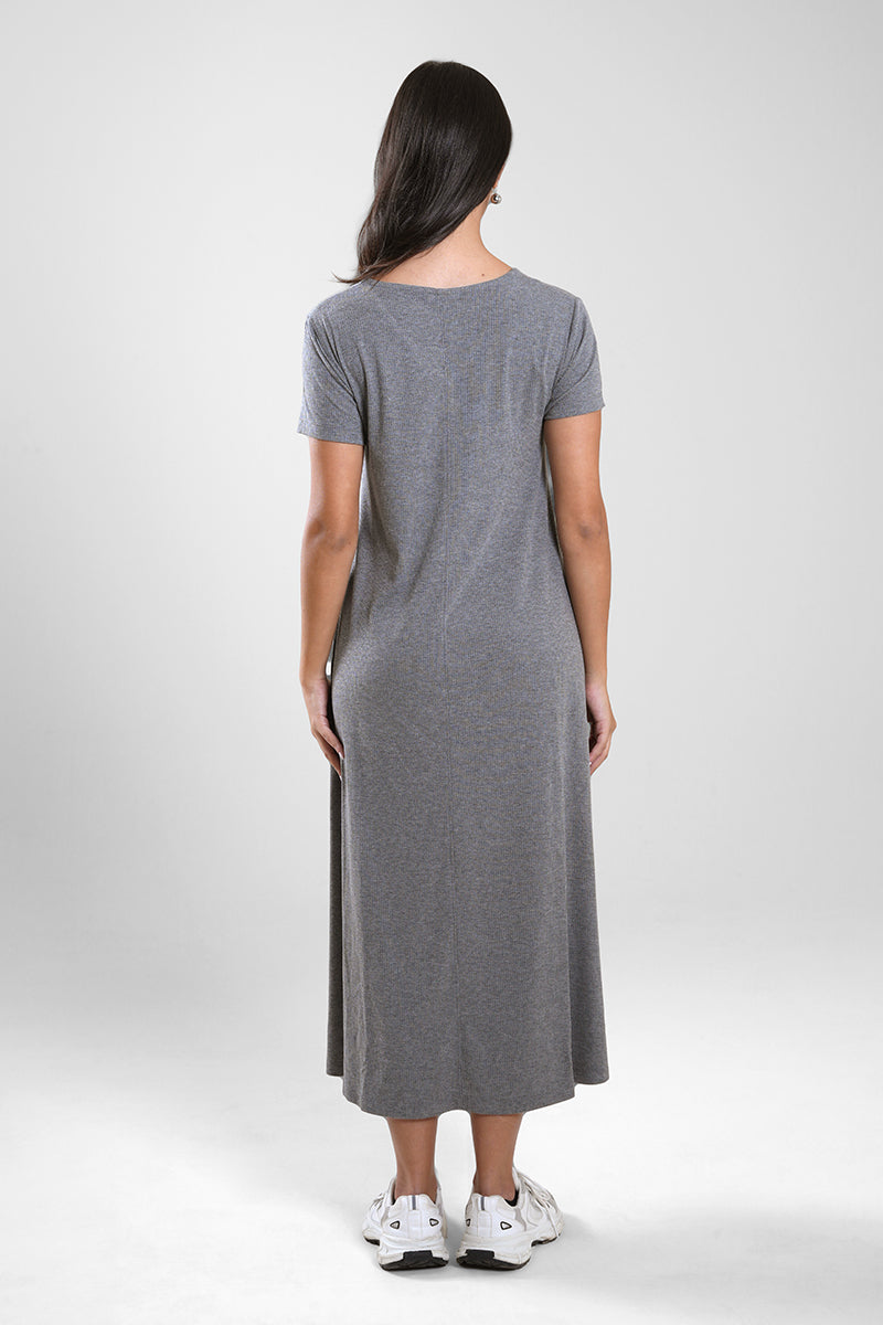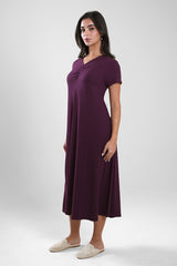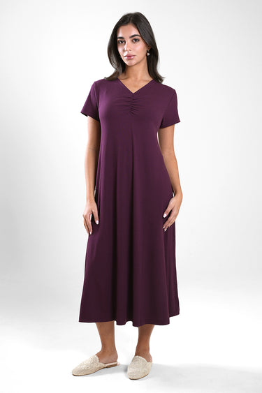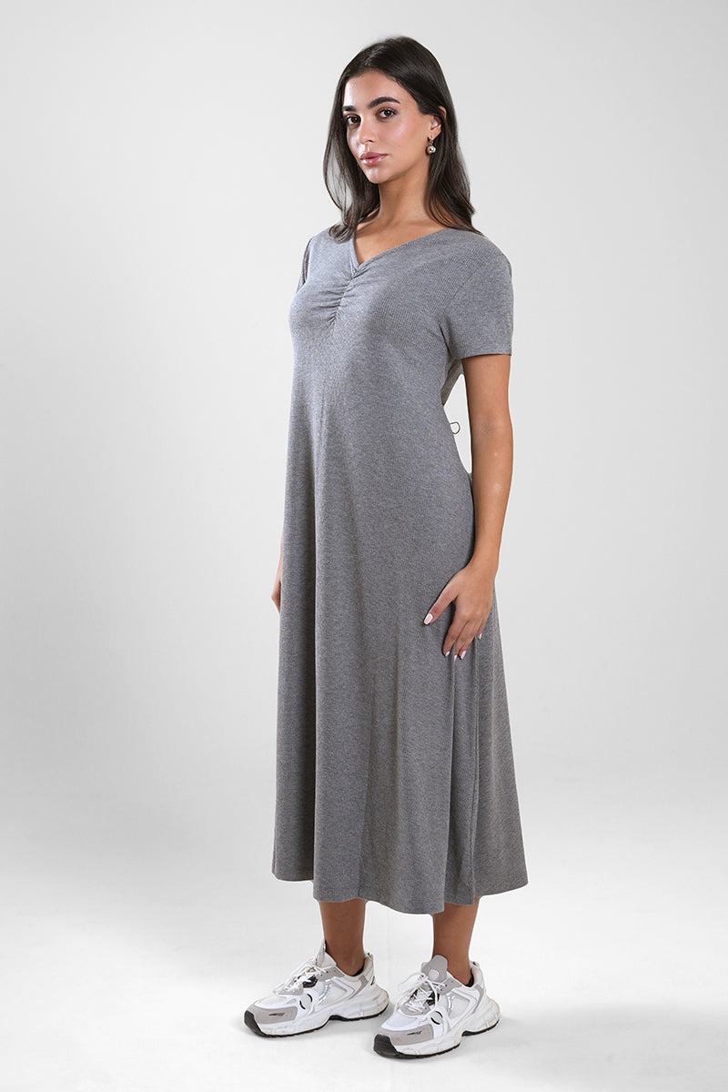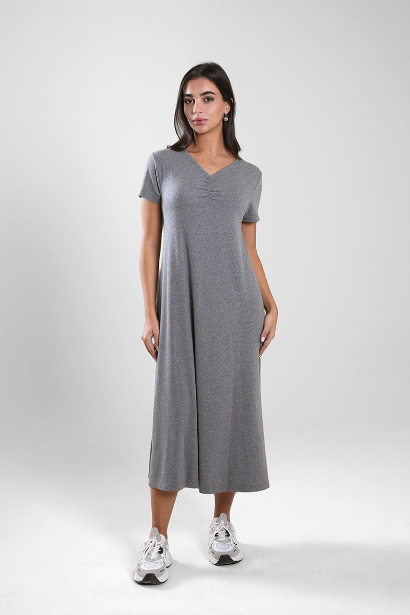 فستان نسائي بطول ميدي وقصة مريحة مع أكمام قصيرة وتصميم بسيط. يتميز بانسيابية تمنح راحة في الحركة ومظهراً أنيقاً يناسب الإطلالات اليومية.