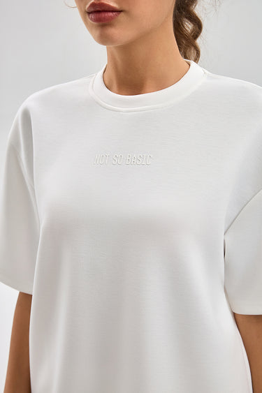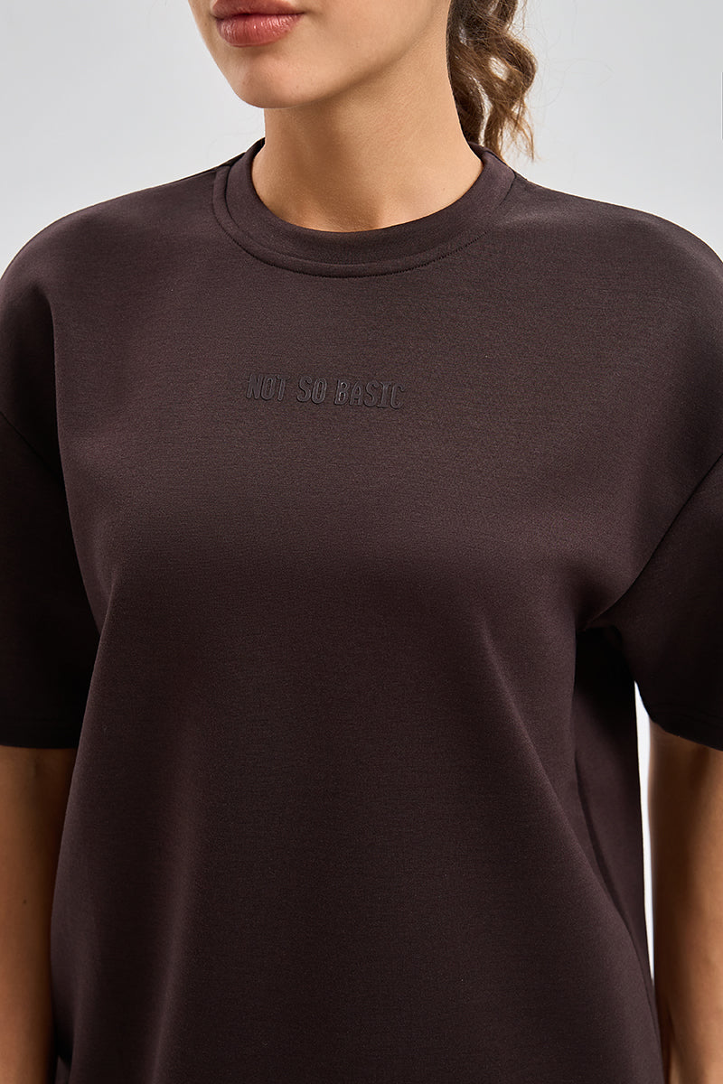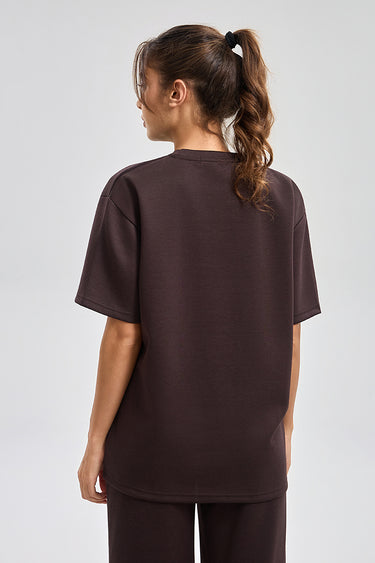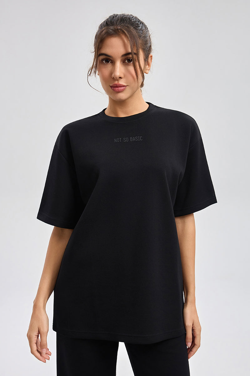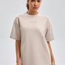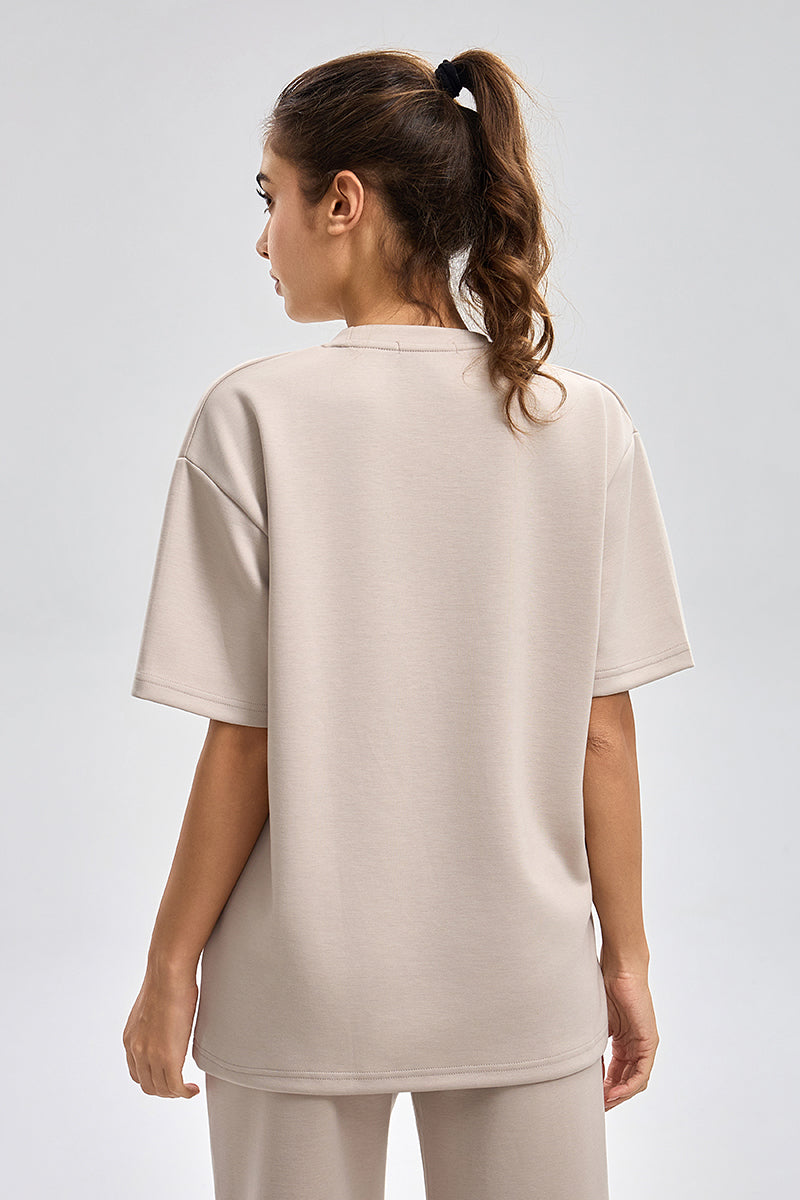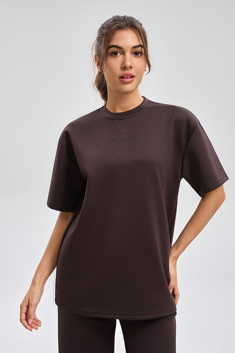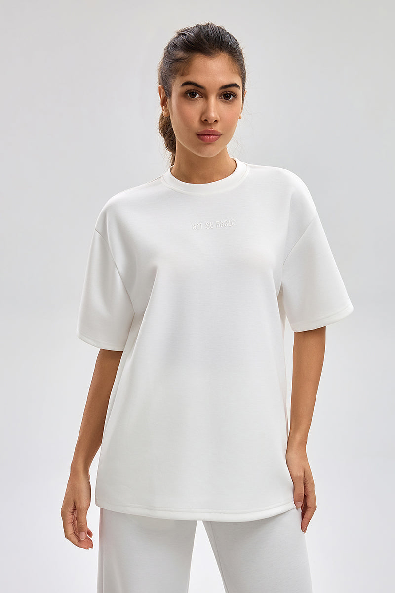 تيشيرت بقصة واسعة مع ياقة دائرية وأكمام قصيرة. تصميم بسيط مع طبعة ناعمة وملمس مريح يمنح راحة طوال اليوم ومظهر كاجوال مناسب للاستخدام اليومي