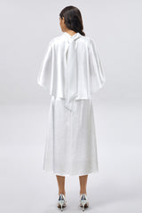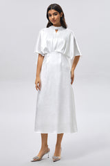 فستان ميدي بتصميم كيب انسيابي يضفي حركة وأناقة على الإطلالة. يتميز بقصة مريحة تمنح راحة في الارتداء مع مظهر أنيق، مناسب للمناسبات الرسمية أو الإطلالات الراقية النهارية والمسائية.