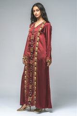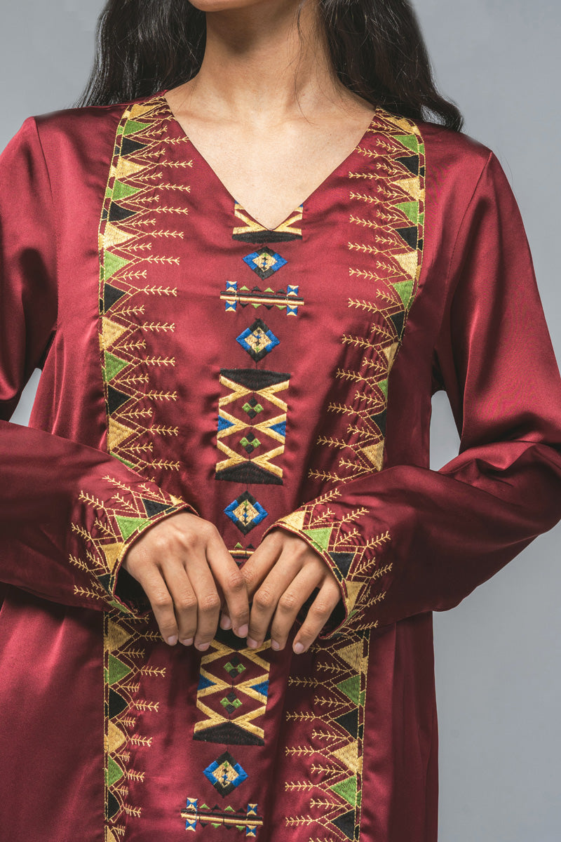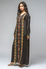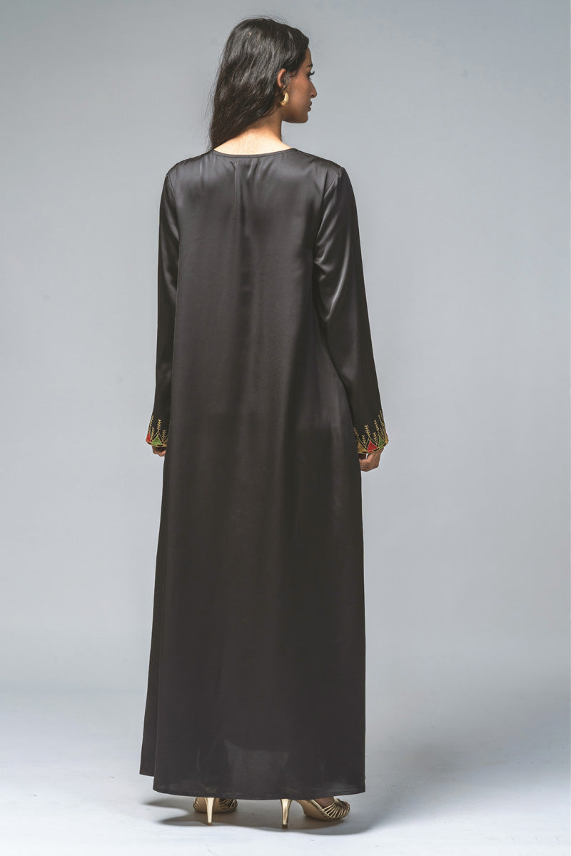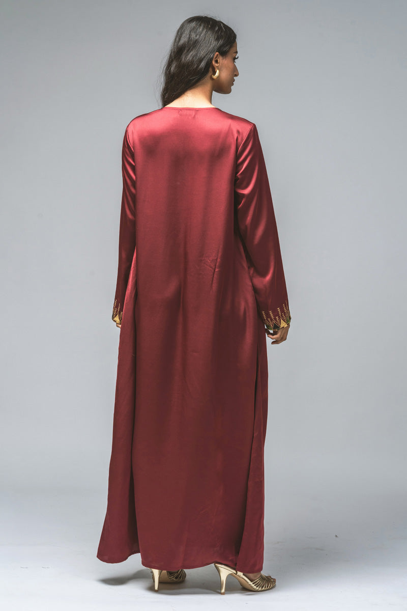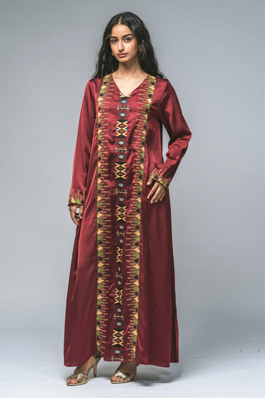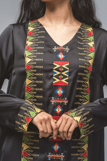 فستان ماكسي بقصّة مستقيمة وأكمام طويلة، يزدان بتطريز دقيق يمتد بشكل عمودي في المقدمة وعند الأساور. يجمع التصميم بين الزخارف التراثية واللمسة العصرية ليقدّم إطلالة متوازنة تناسب المناسبات الرسمية والفعاليات الثقافية. قماش خفيف وقصّة مريحة تمنح إحساساً بالراحة مع حضور أنيق محافظ.