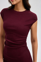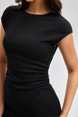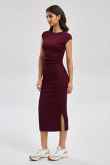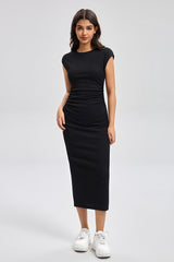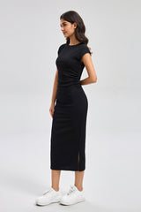 فستان ميدي بتصميم أنيق وقصة ضيقة تبرز الشكل بانسيابية. يأتي بأكمام قصيرة وياقة دائرية بسيطة تناسب الإطلالات اليومية. مزود بفتحة جانبية تمنح حرية حركة ولمسة عصرية هادئة. مناسب للاستخدام اليومي