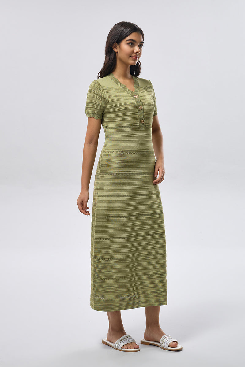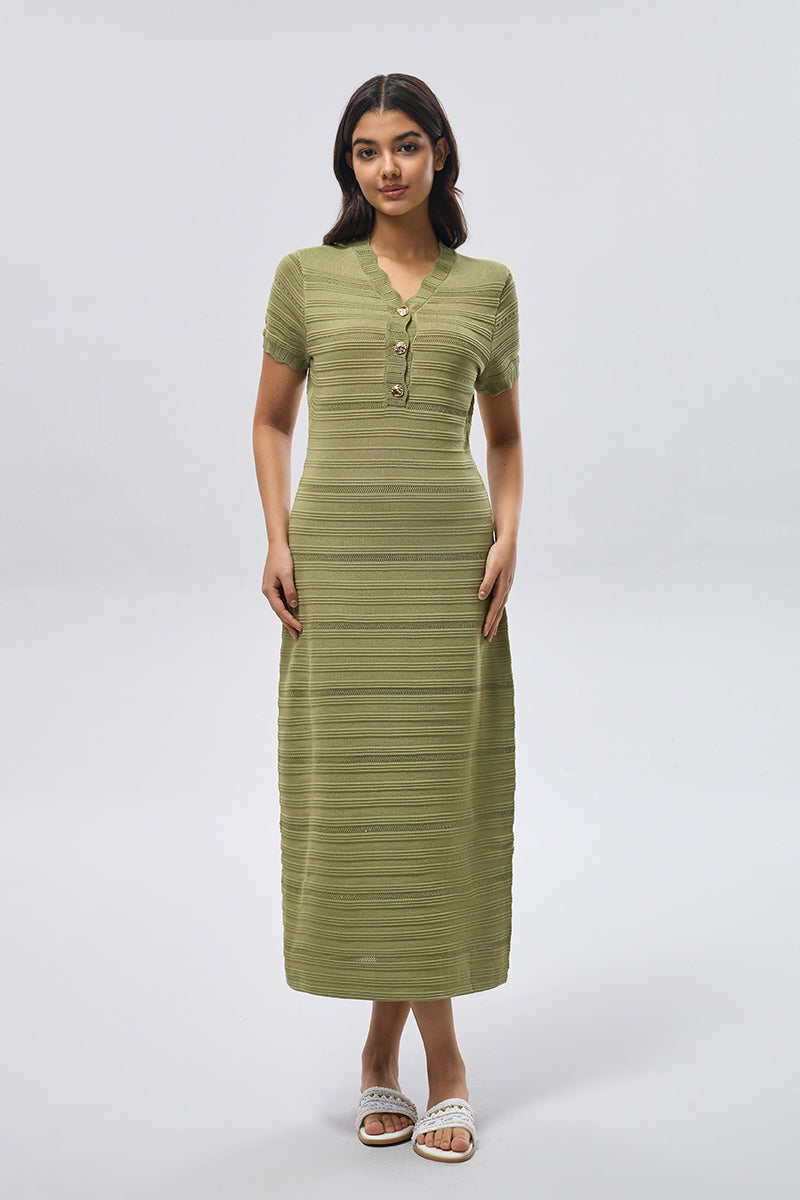 فستان ميدي بقصة انسيابية مصنوع من قماش محبوك مضلع، يتميز بأكمام قصيرة وتصميم بأزرار أمامية جزئية لمظهر أنيق وبسيط. يمنح قصة مريحة مع تحديد ناعم للجسم، مما يجعله مناسباً للاستخدام اليومي والإطلالات الكاجوال.