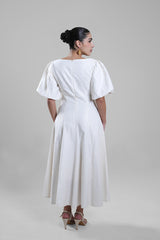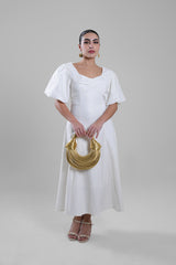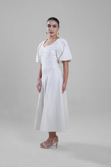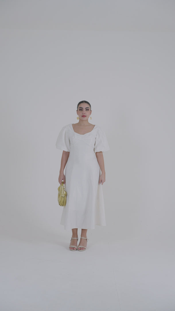 فستان طويل بتصميم أنيق ونسيج بارز ناعم يمنح لمسة فاخرة. يتميز بأكمام قصيرة منفوخة وياقة مصممة بانسيابية تبرز الأنوثة بأسلوب راقٍ. تنسدل القصة بسلاسة لتمنح حركة خفيفة، مما يجعله مناسباً للمناسبات النهارية، التجمعات الرسمية، أو الإطلالات اليومية الراقية.