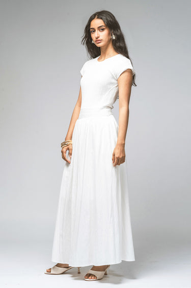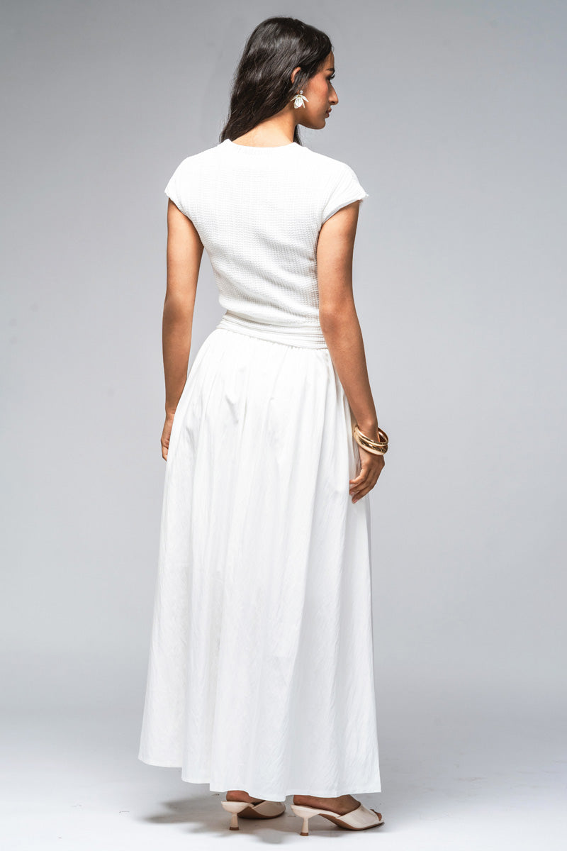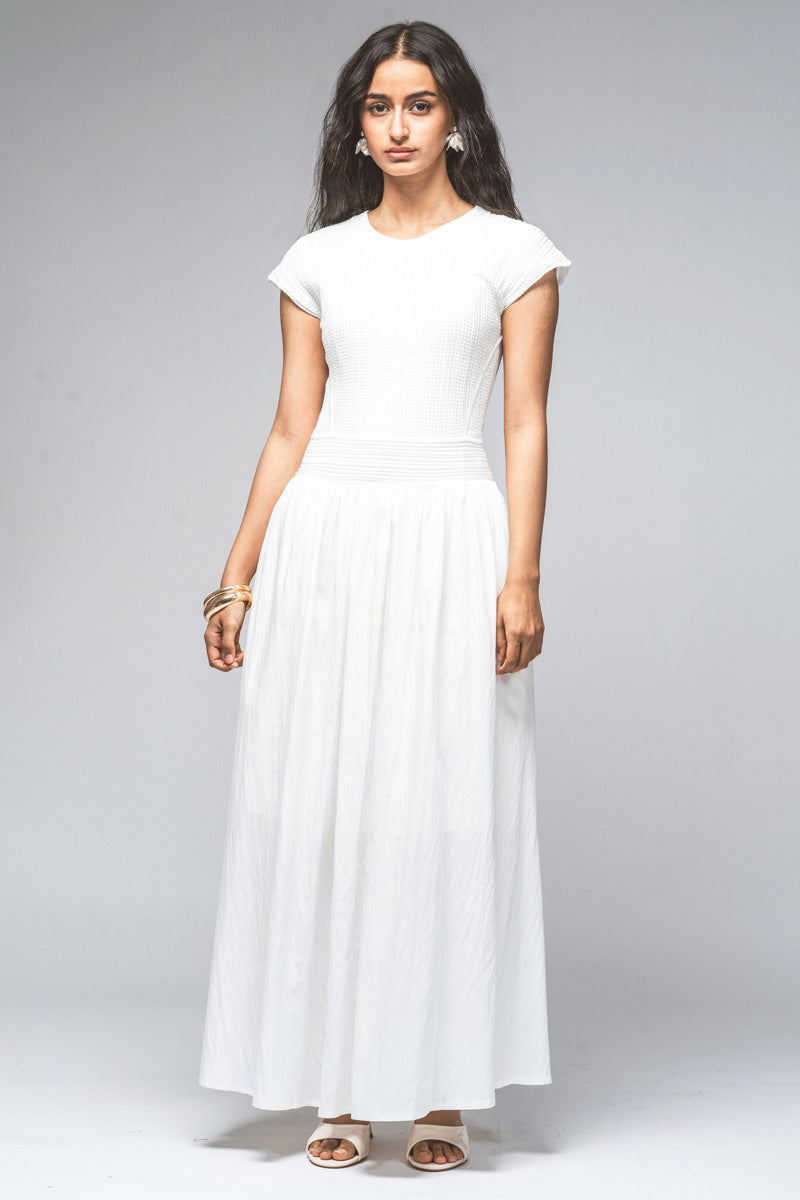 فستان ماكسي بتصميم ناعم وبملمس منقوش مع قصّة انسيابية بسيطة. يأتي بأكمام قصيرة وخصر مجمّع بخفة يمنح حركة مريحة ومظهراً متوازناً. خامة خفيفة مناسبة للارتداء طوال اليوم، وقصّة عملية يسهل تنسيقها لإطلالات يومية أو أكثر أناقة.