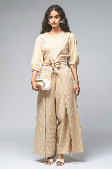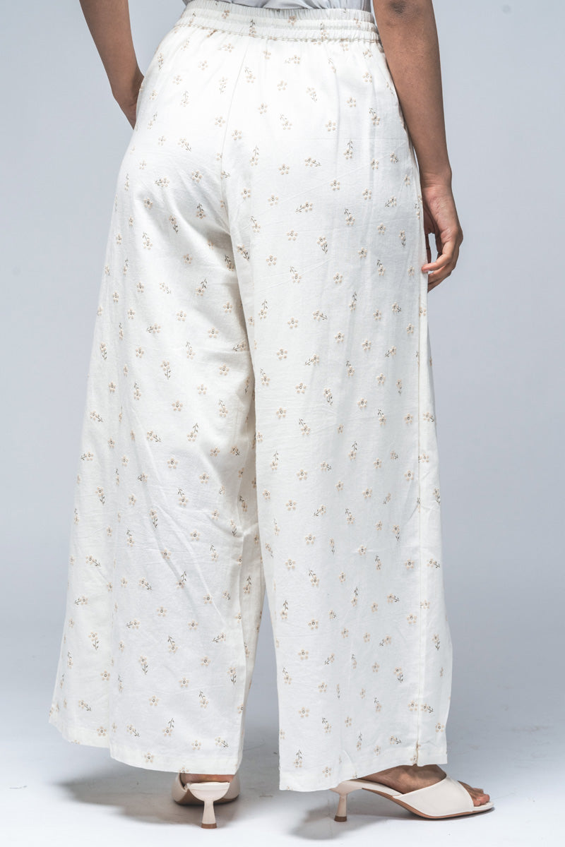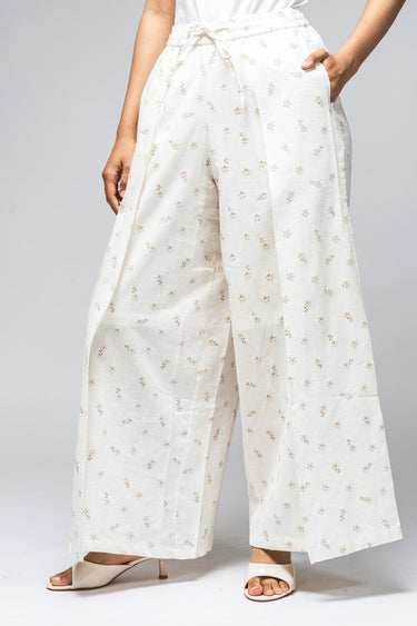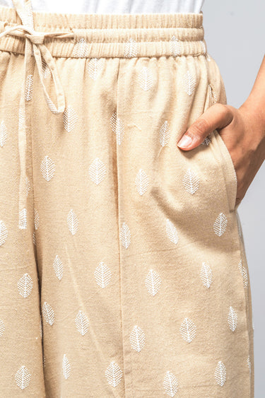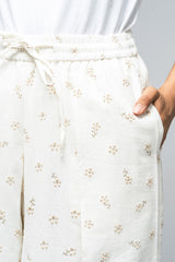 بنطلون بقصّة واسعة تمنح راحة وحركة سلسة طوال اليوم. يتميز بنمط تطريز ناعم موزّع بأسلوب هادئ يضيف لمسة أنيقة غير متكلّفة، مع خصر مطاطي ورباط قابل للتعديل لملاءمة مرنة. تصميم عملي بجيوب جانبية وخامة خفيفة تناسب الارتداء اليومي وتنسجم بسهولة مع البلوزات القصيرة أو القمصان الفضفاضة.